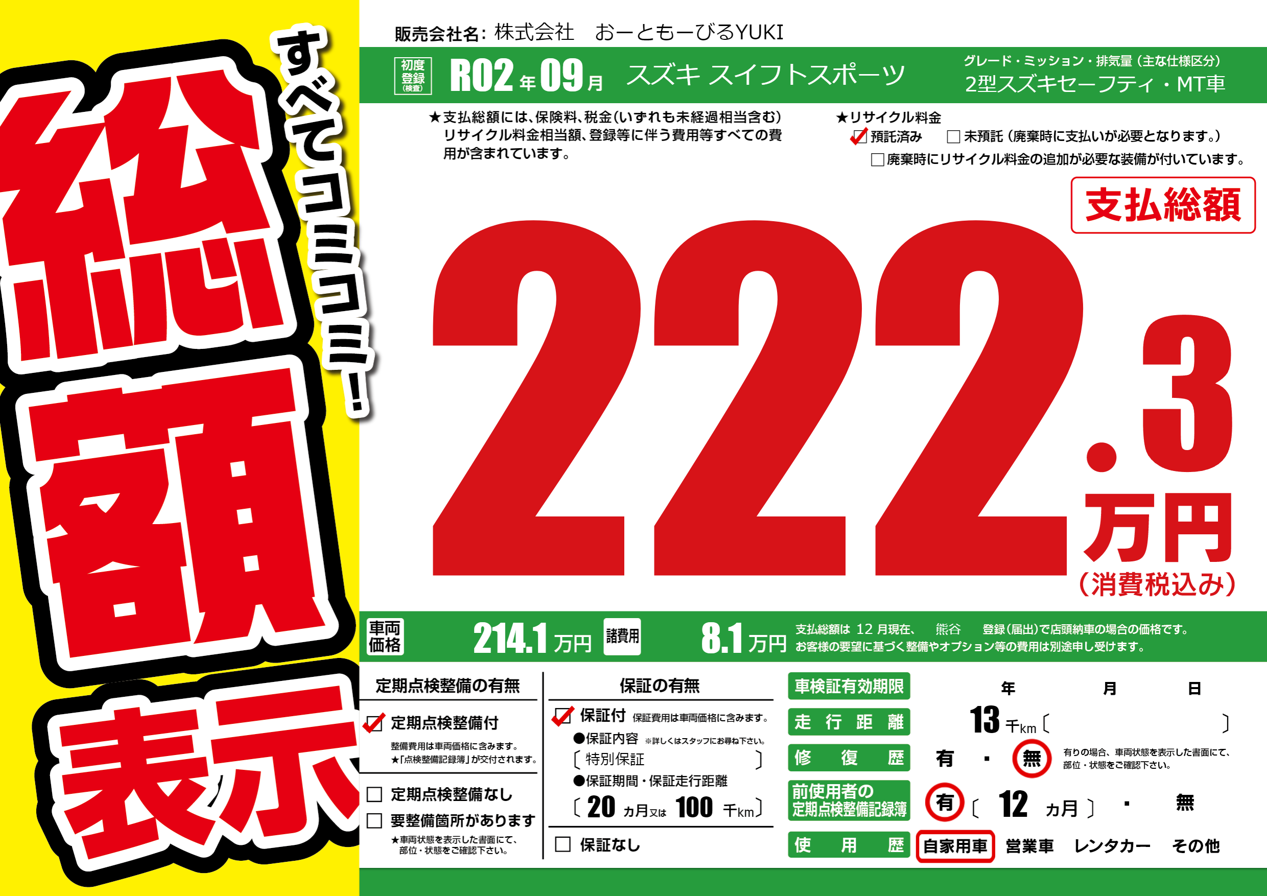 | 走行キロ | 1.3万km | 初年度登録 | R02年09月 |