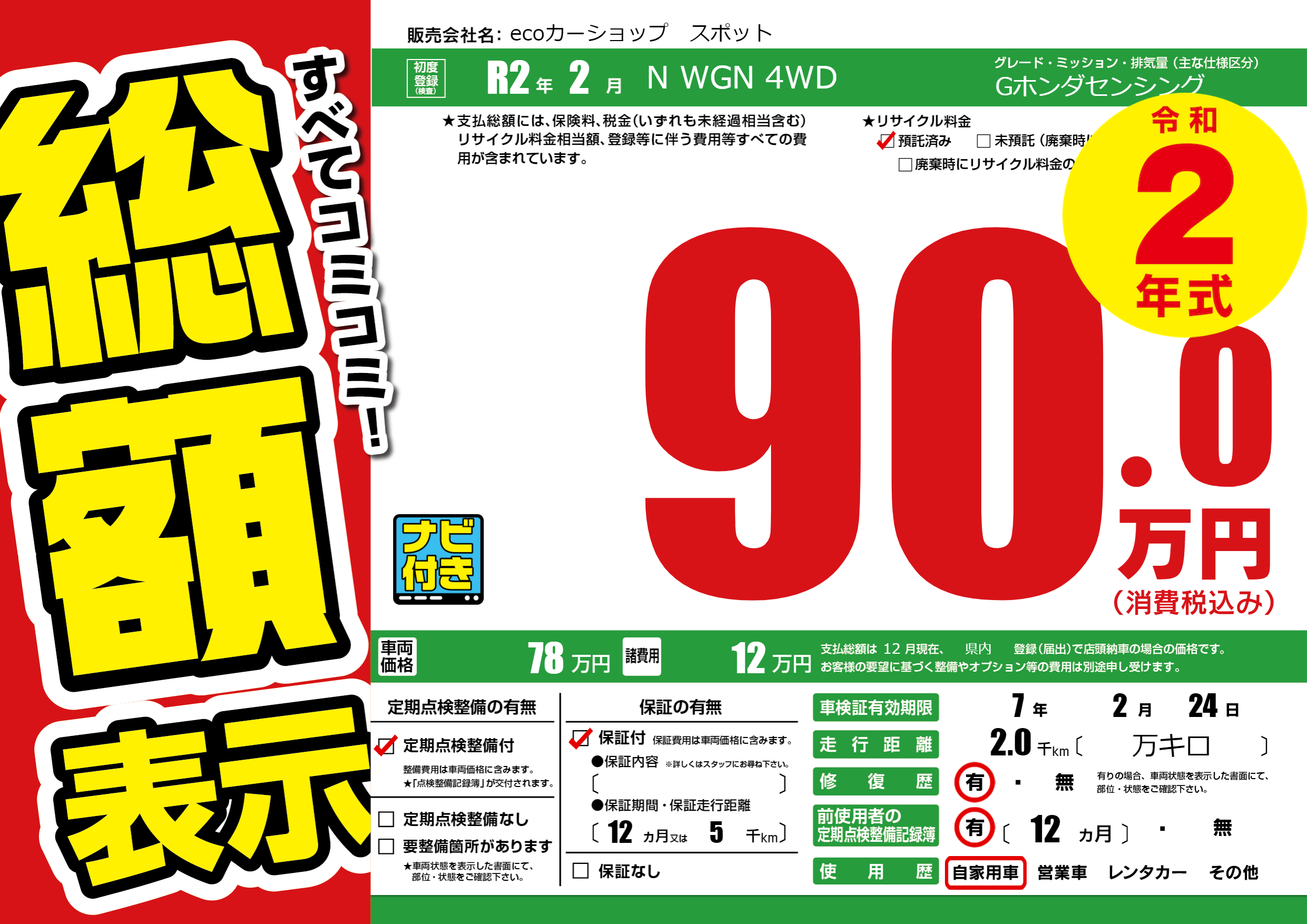 | 車名 | N WGN 4WD | グレード ミッション 排気量 |