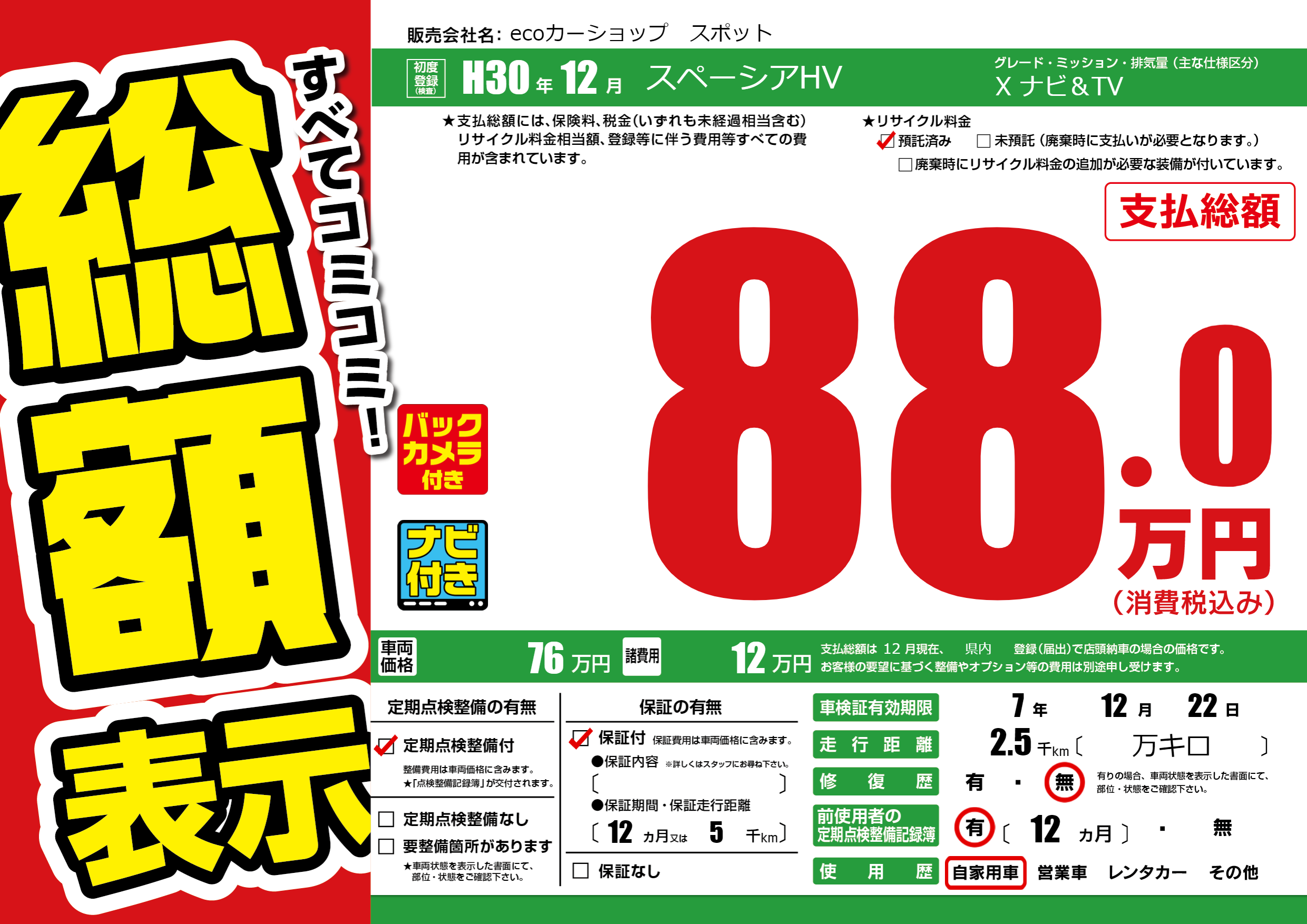 | 車名 | スペーシアHV | グレード ミッション 排気量 |
