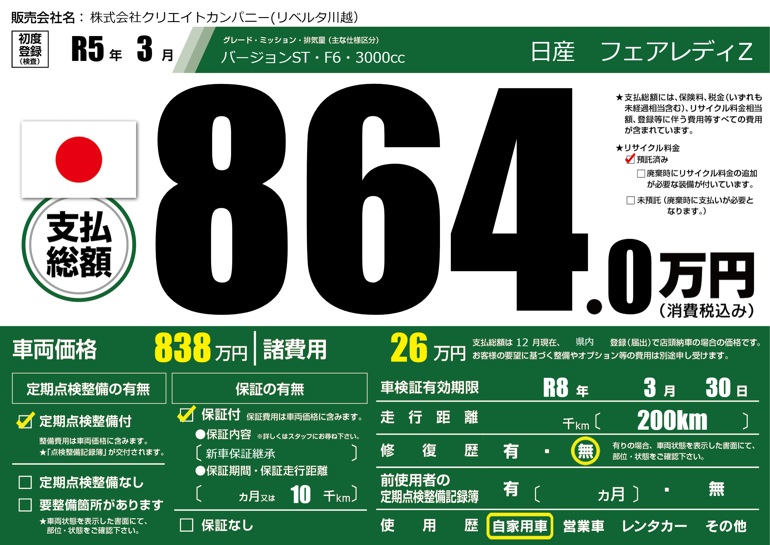 | 車名 | 日産 フェアレディZ | グレード ミッション 排気量 |