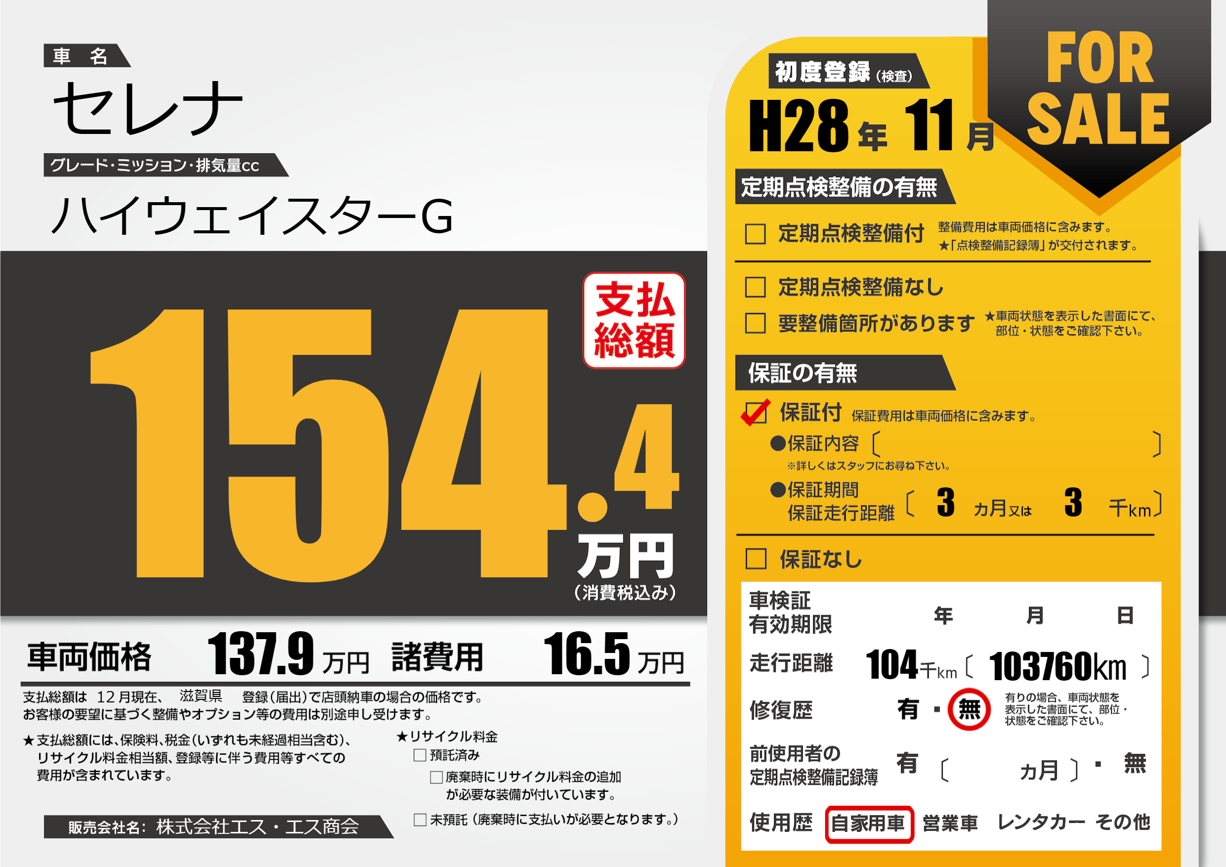 | 走行キロ | 10.4万km | 初年度登録 | H28年11月 |