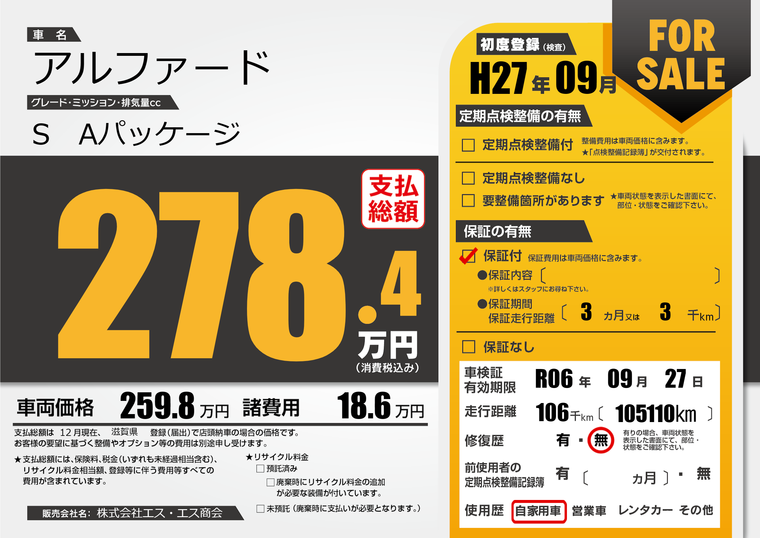| 車名 | アルファード | グレード ミッション 排気量 |