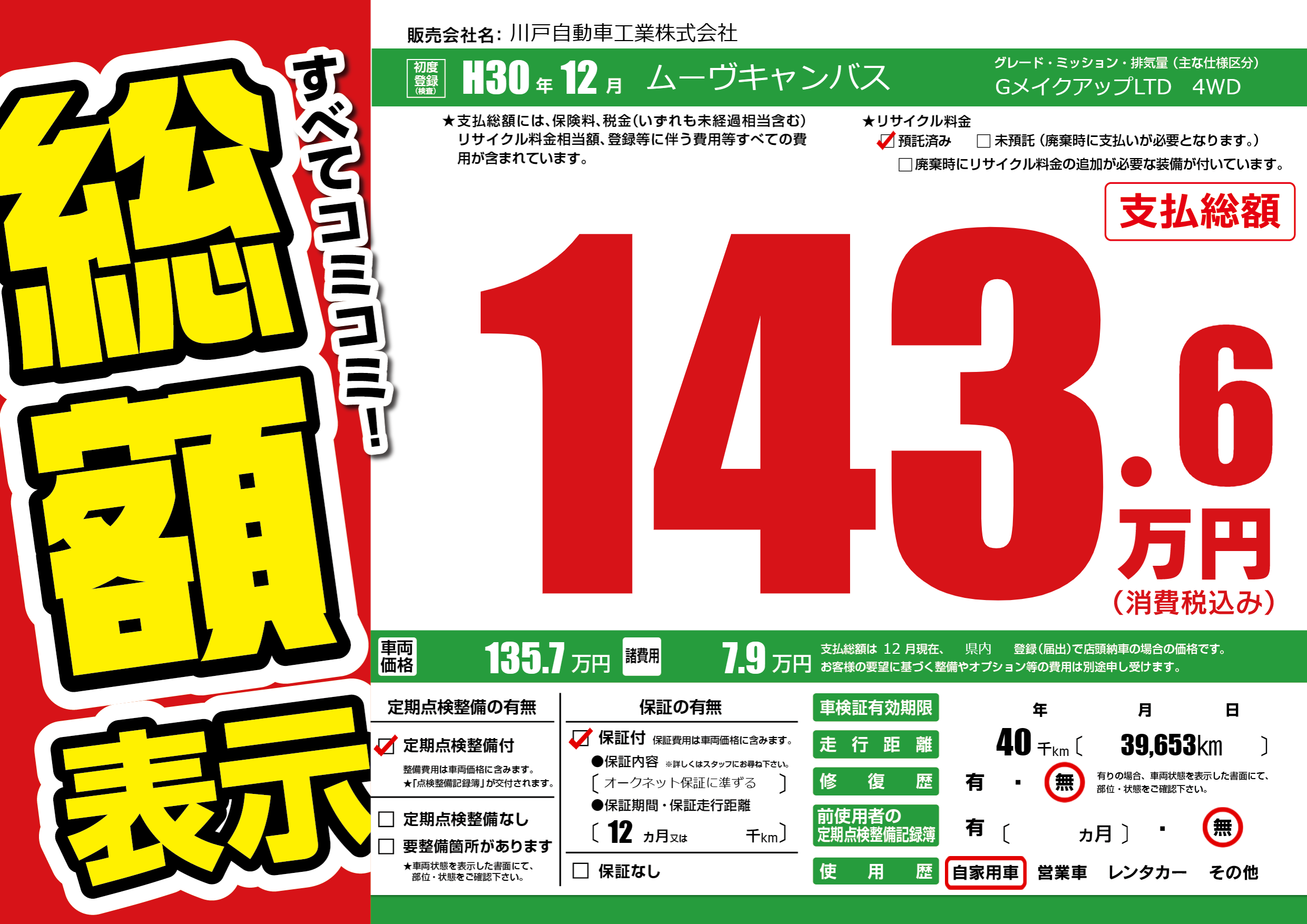 | 走行キロ | 4万km | 初年度登録 | H30年12月 |