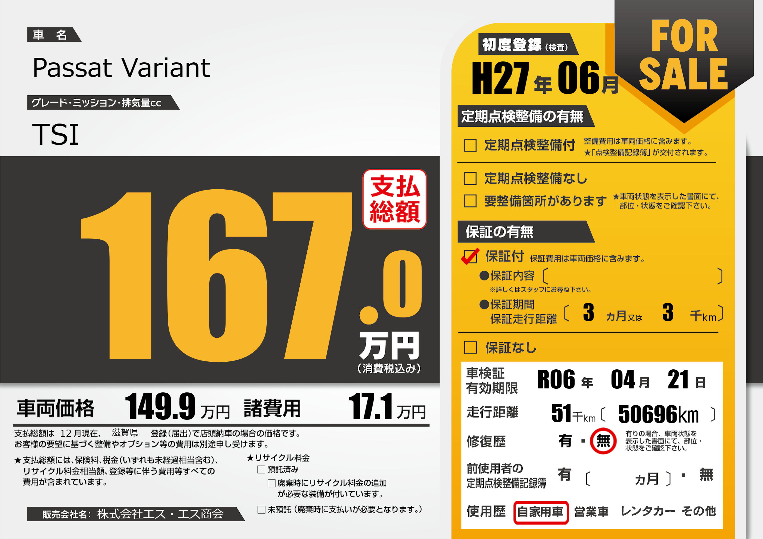 | 車名 | Passat Variant | グレード ミッション 排気量 |