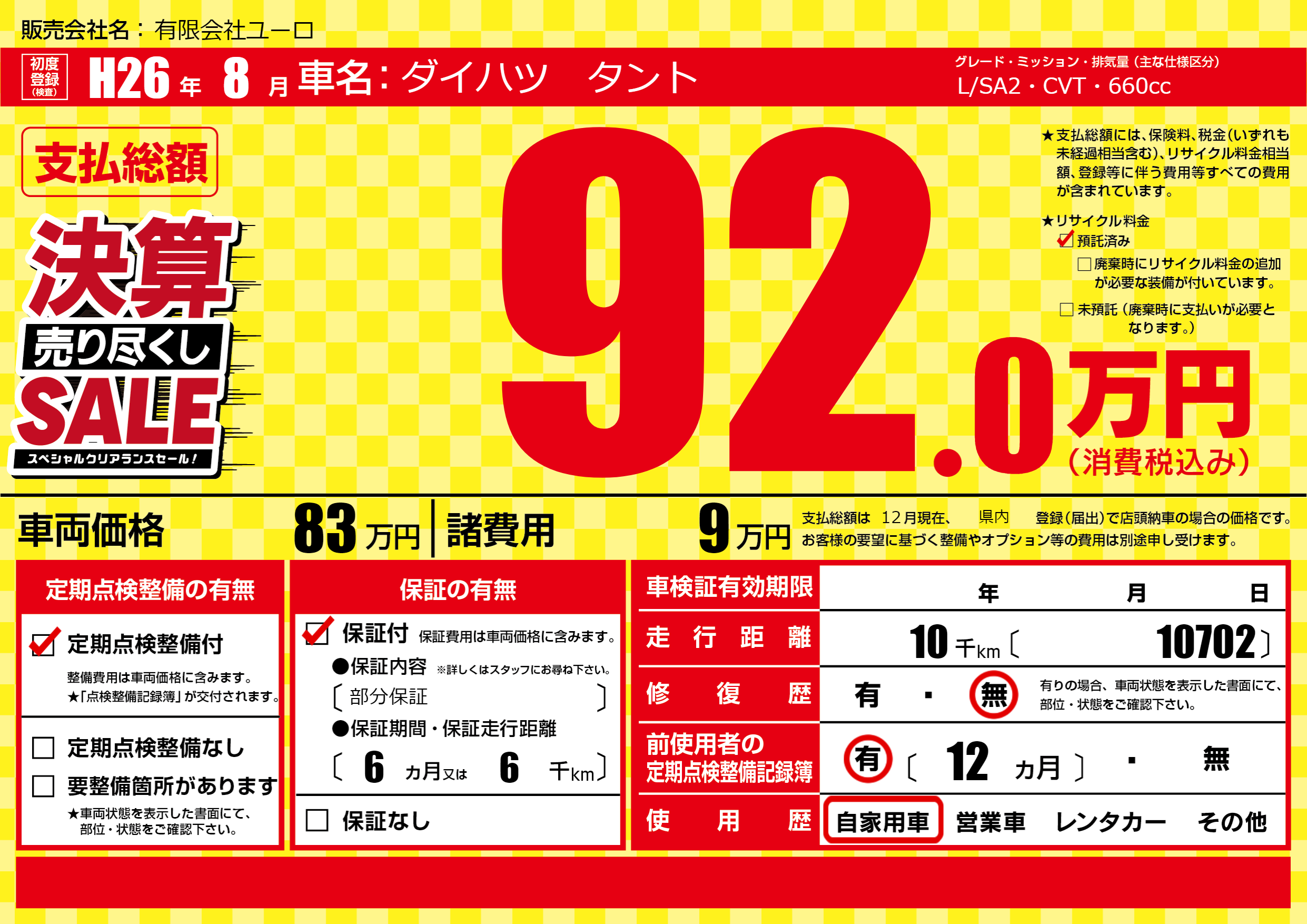 | 車名 | ダイハツ タント | グレード ミッション 排気量 |
