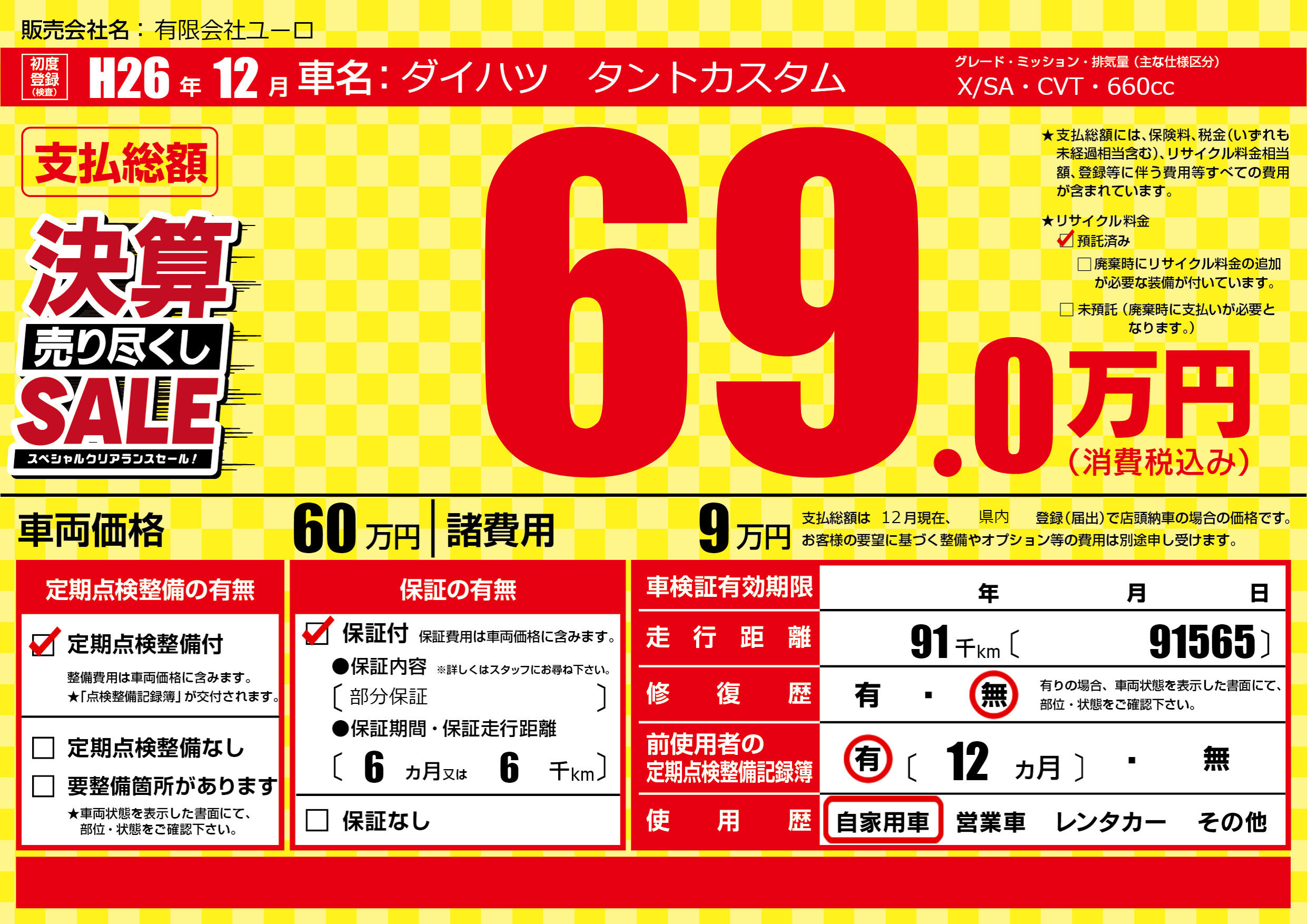 | 走行キロ | 9.1万km | 初年度登録 | H26年12月 |