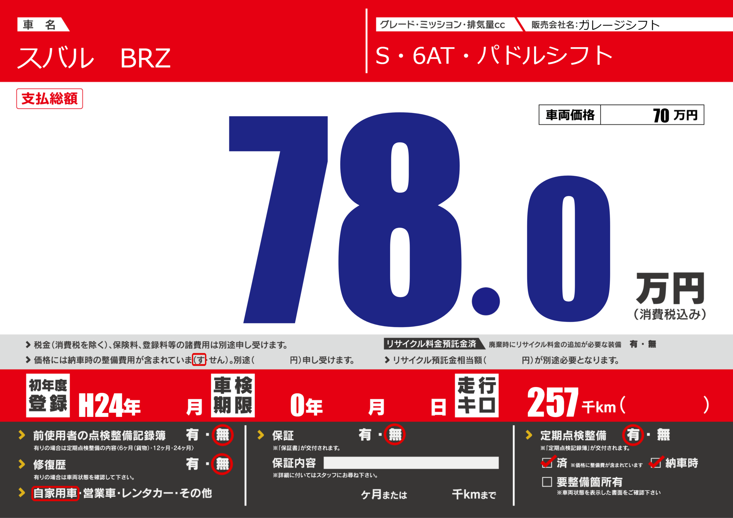 | 車名 | スバル BRZ | グレード ミッション 排気量 |