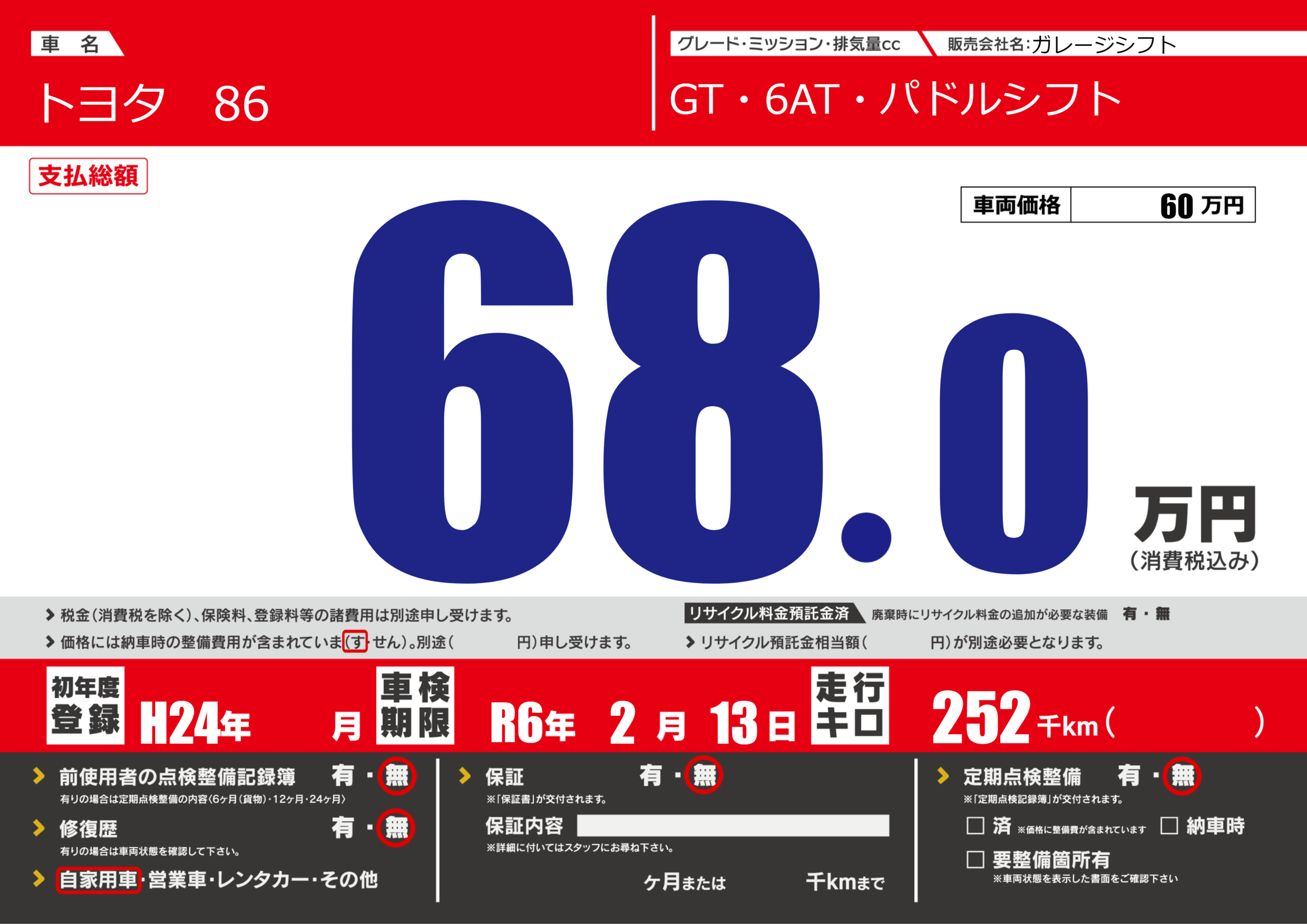 | 車名 | トヨタ 86 | グレード ミッション 排気量 |