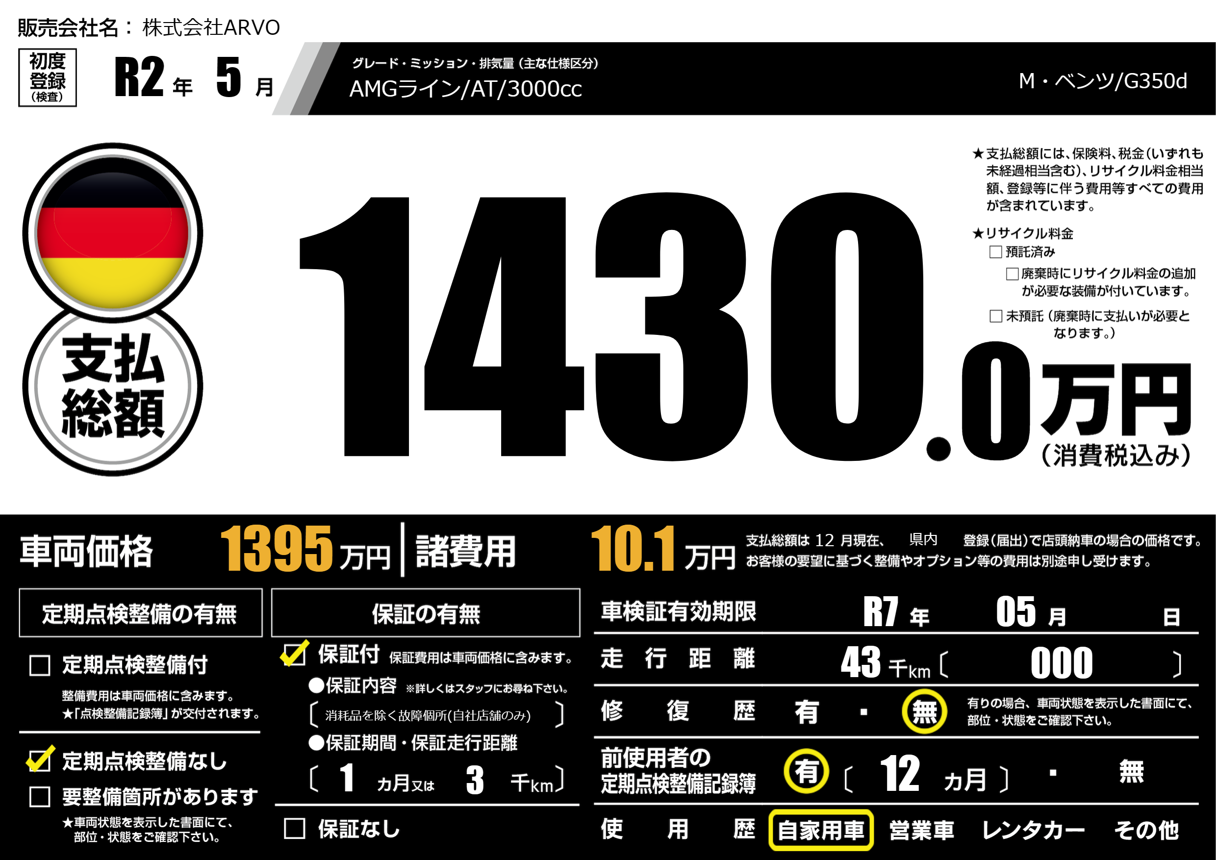 | 車名 | M・ベンツ/G350d | グレード ミッション 排気量 |