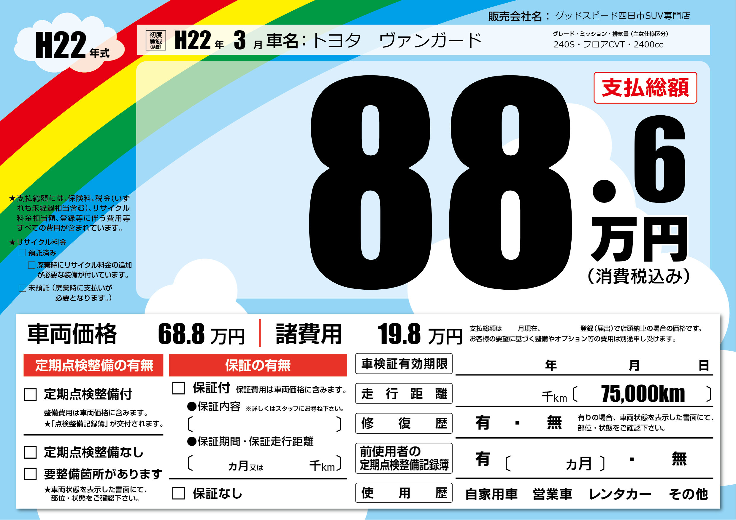 | 車名 | トヨタ ヴァンガード | グレード ミッション 排気量 |