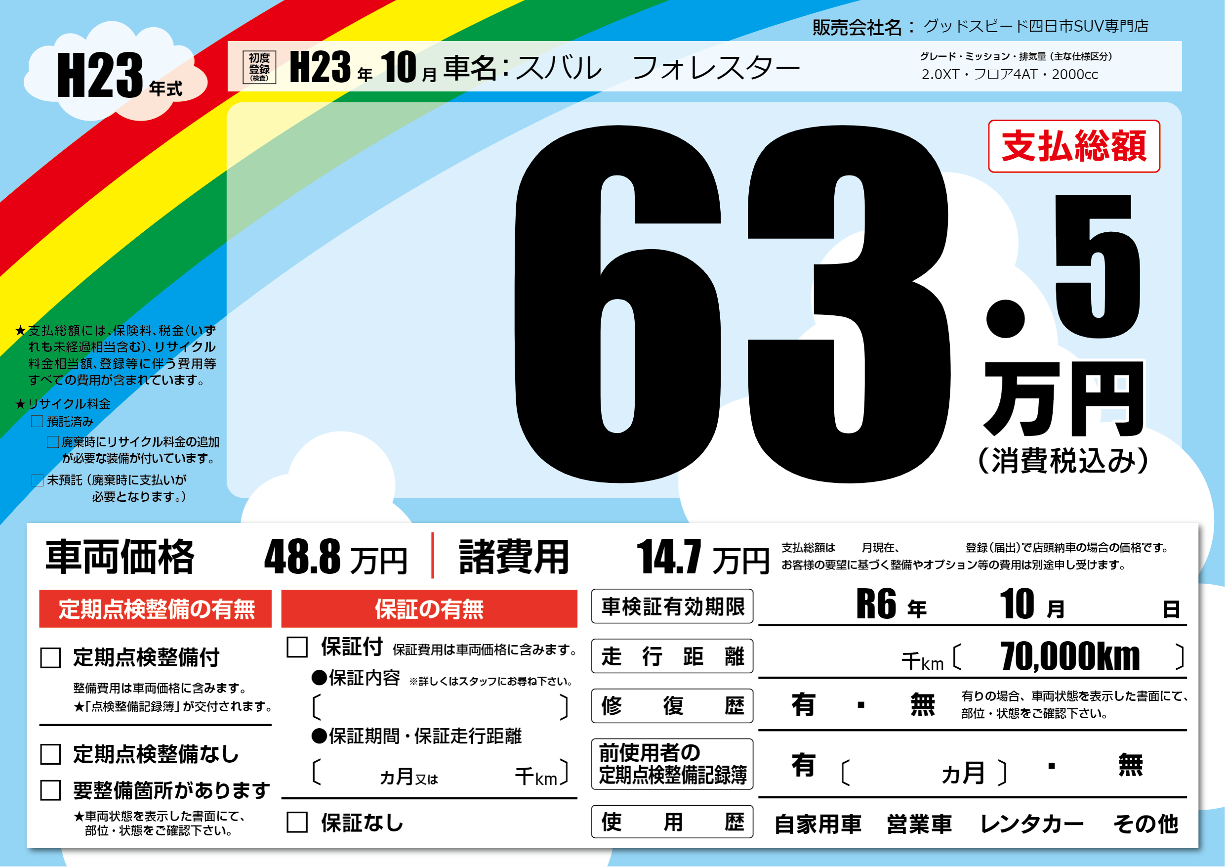 | 車名 | スバル フォレスター | グレード ミッション 排気量 |