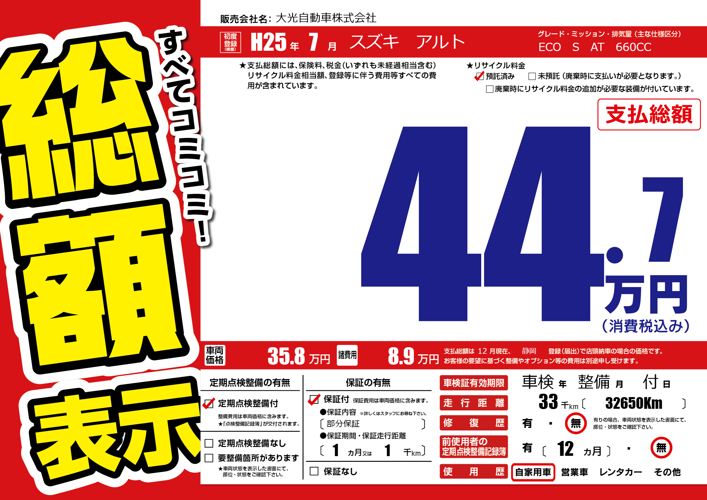 | 車名 | スズキ アルト | グレード ミッション 排気量 |