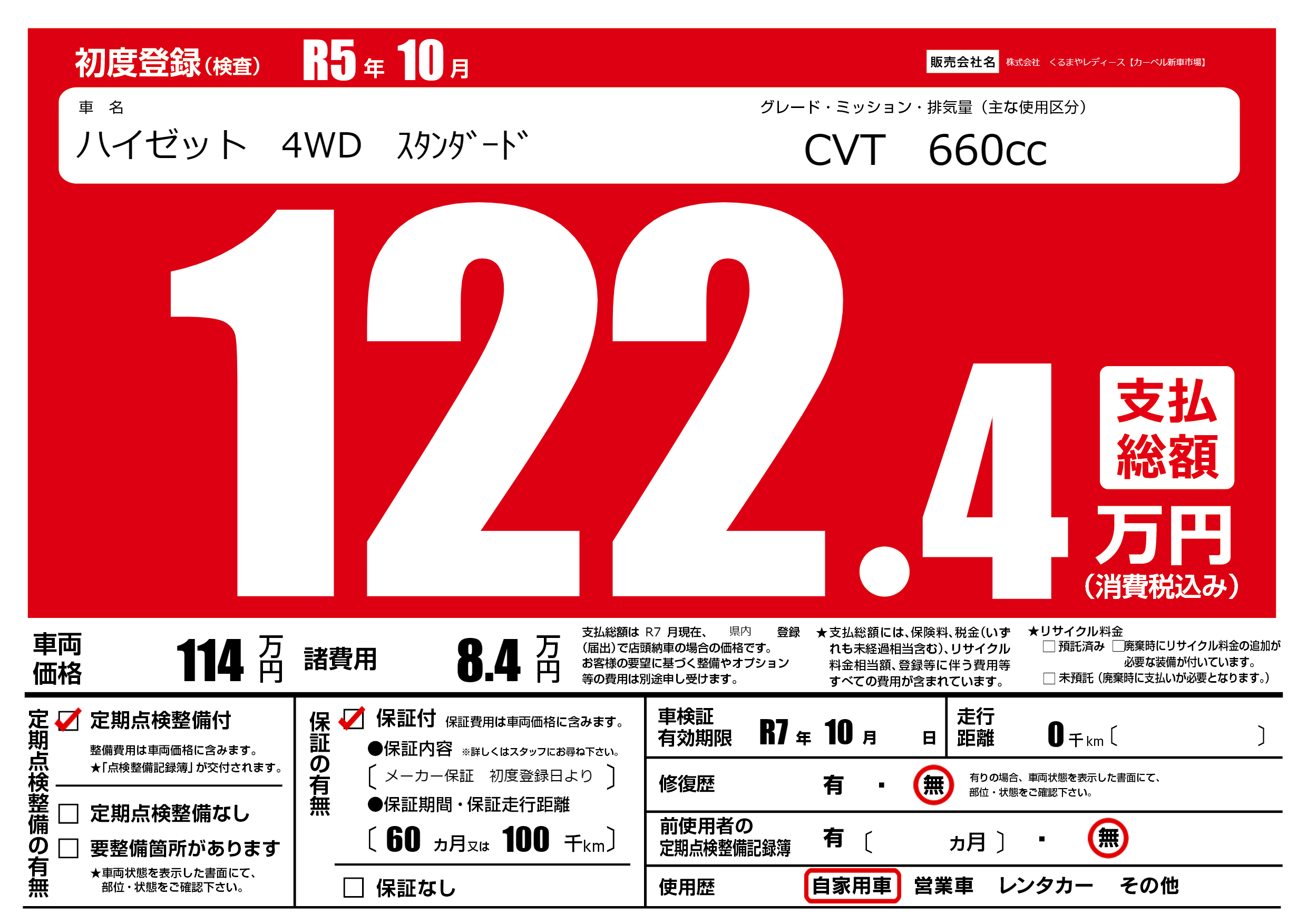 | 走行キロ | - | 初年度登録 | R5年10月 |