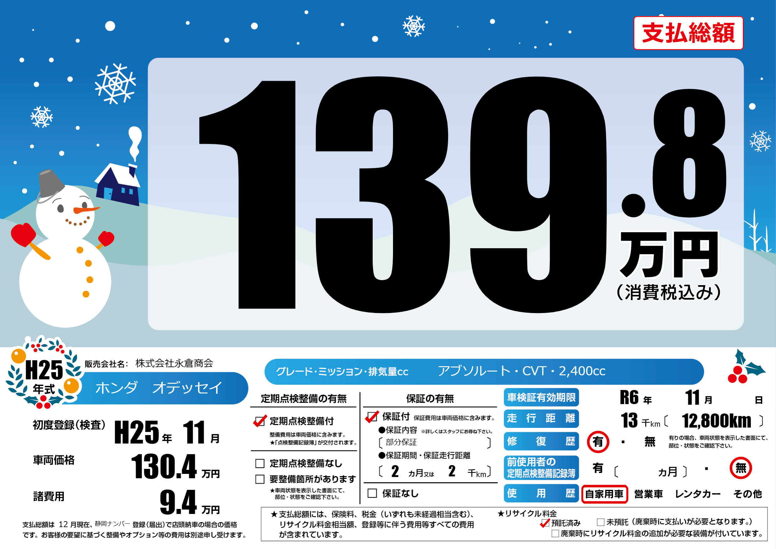 | 走行キロ | 1.3万km | 初年度登録 | H25年11月 |