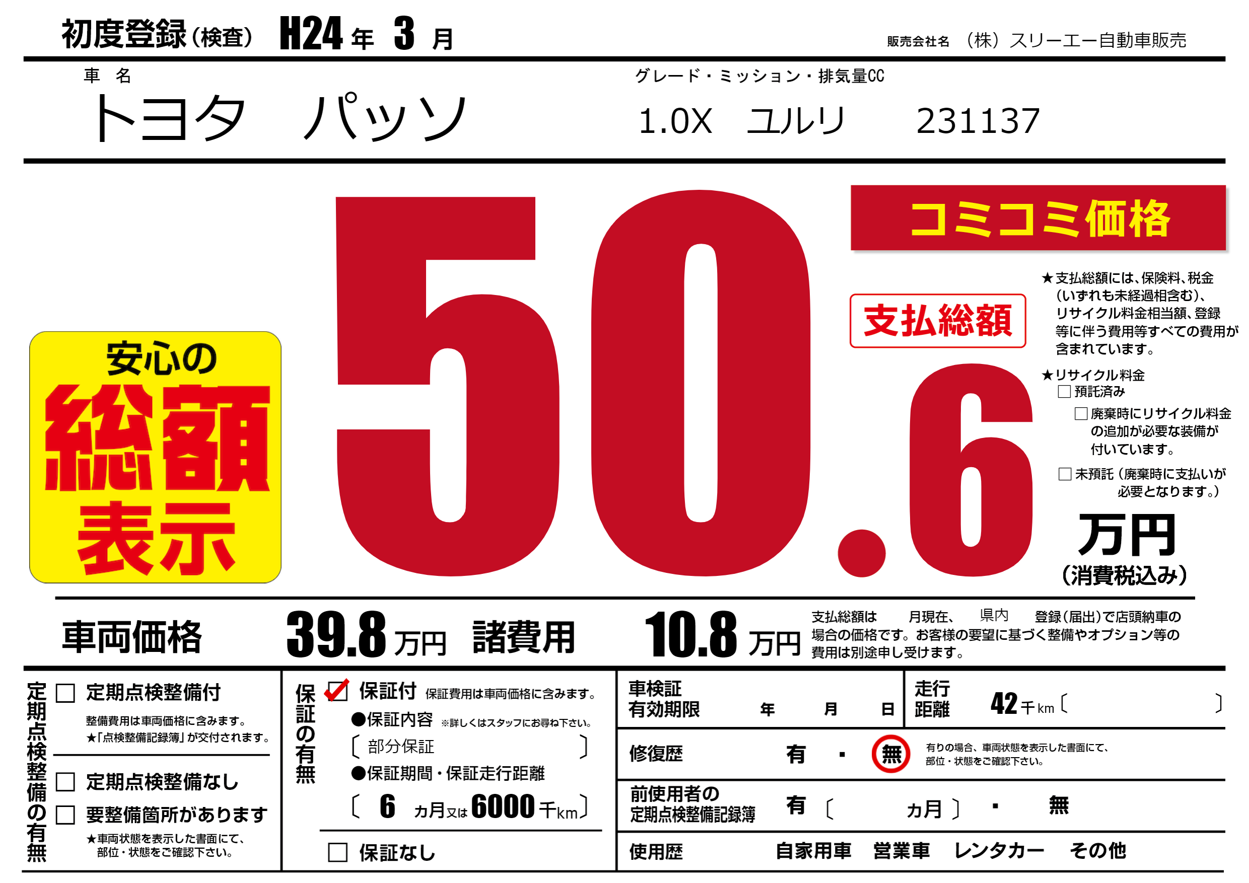 | 車名 | トヨタ パッソ | グレード ミッション 排気量 |