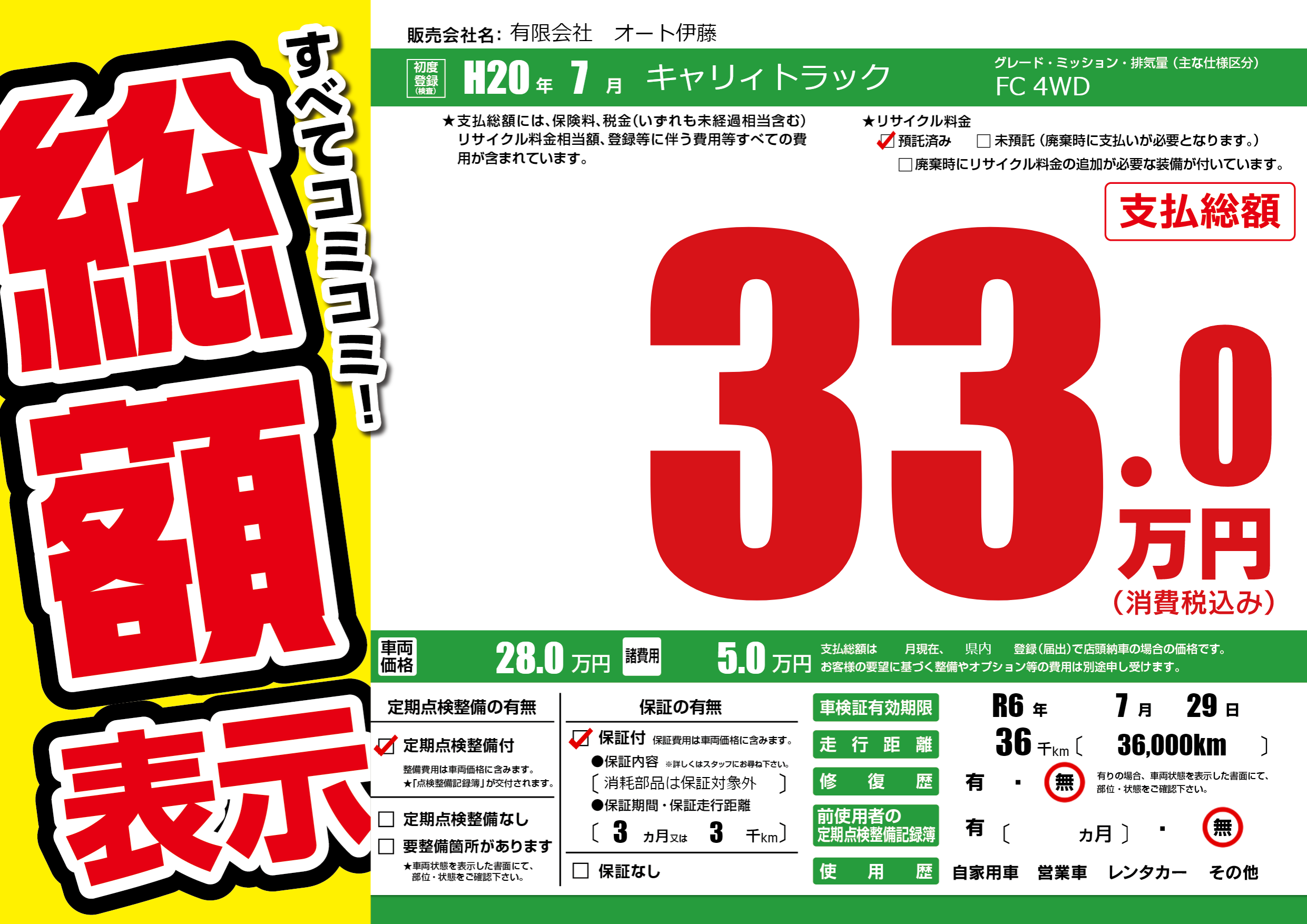 保証付き 保証内容(消耗部品は保証対象外) 3ヶ月または(3)千kmまで |
