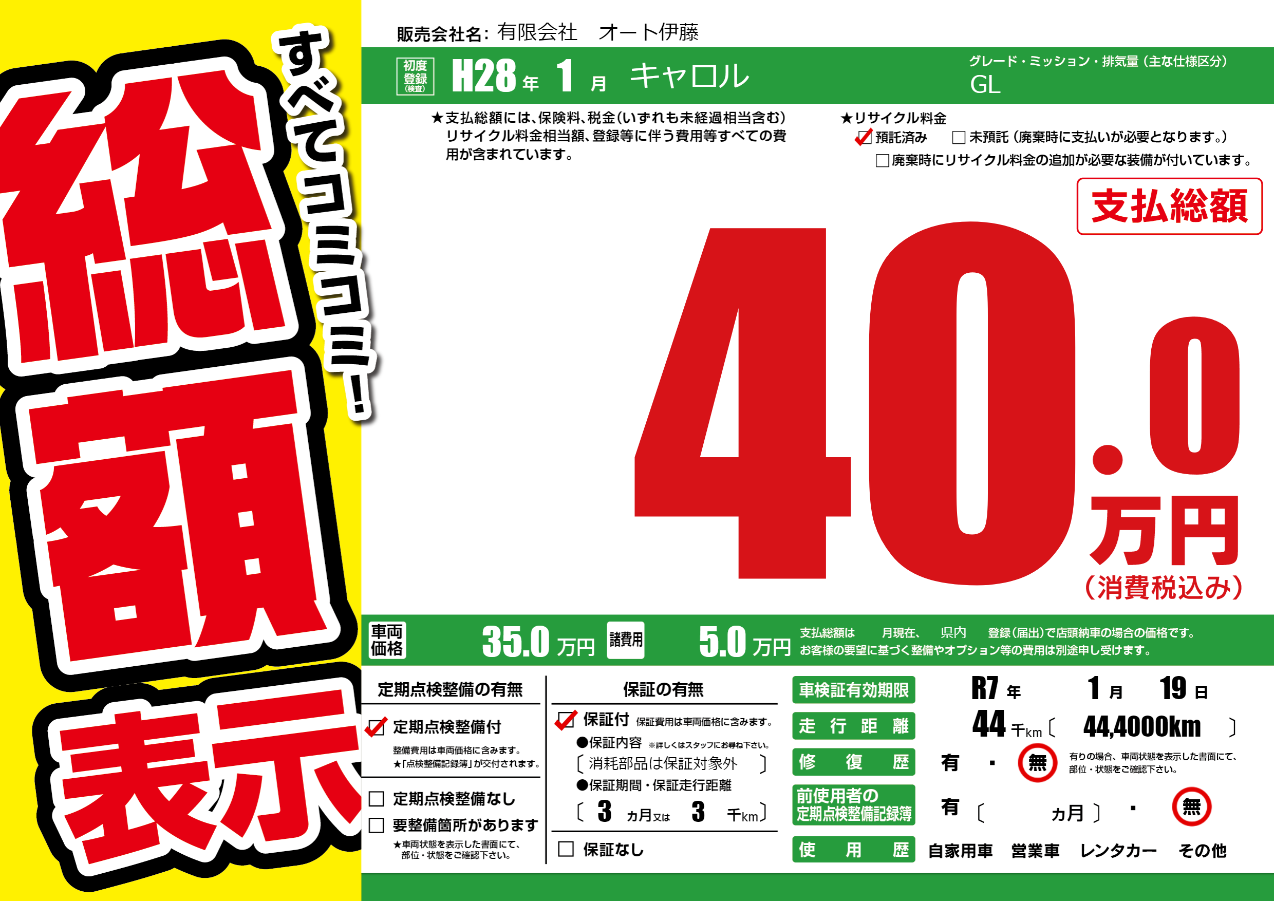 | 車名 | キャロル | グレード ミッション 排気量 |
