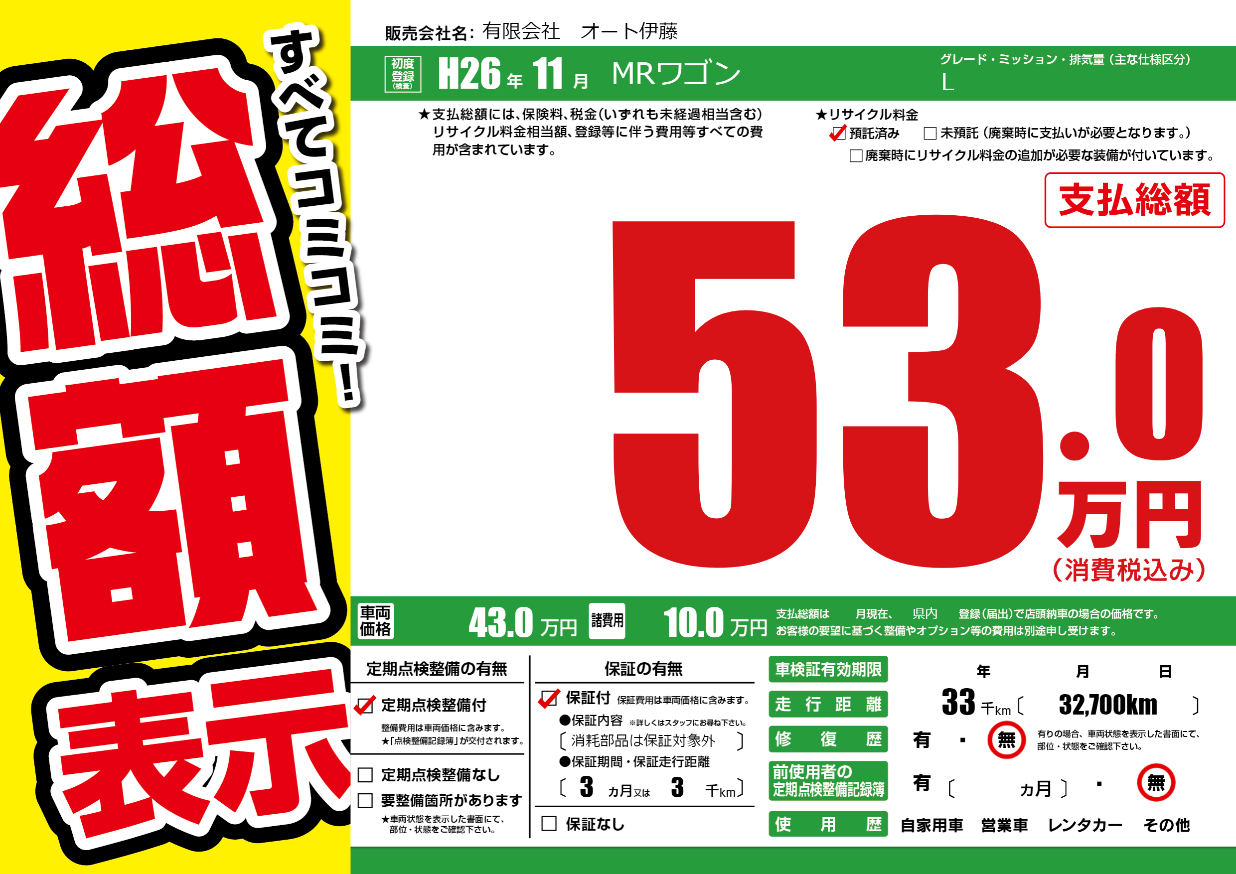 | 車名 | MRワゴン | グレード ミッション 排気量 |