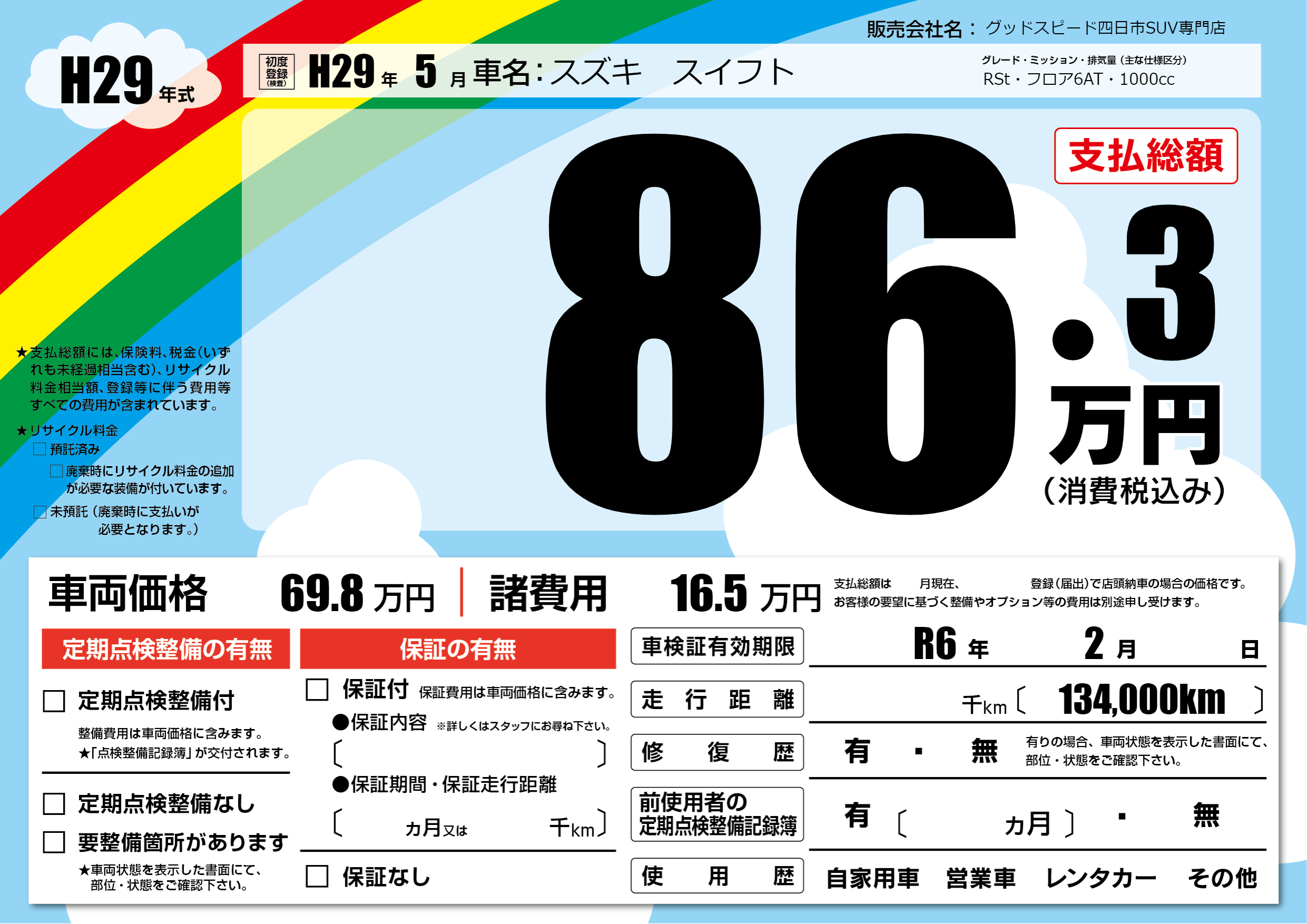 | 車名 | スズキ スイフト | グレード ミッション 排気量 |