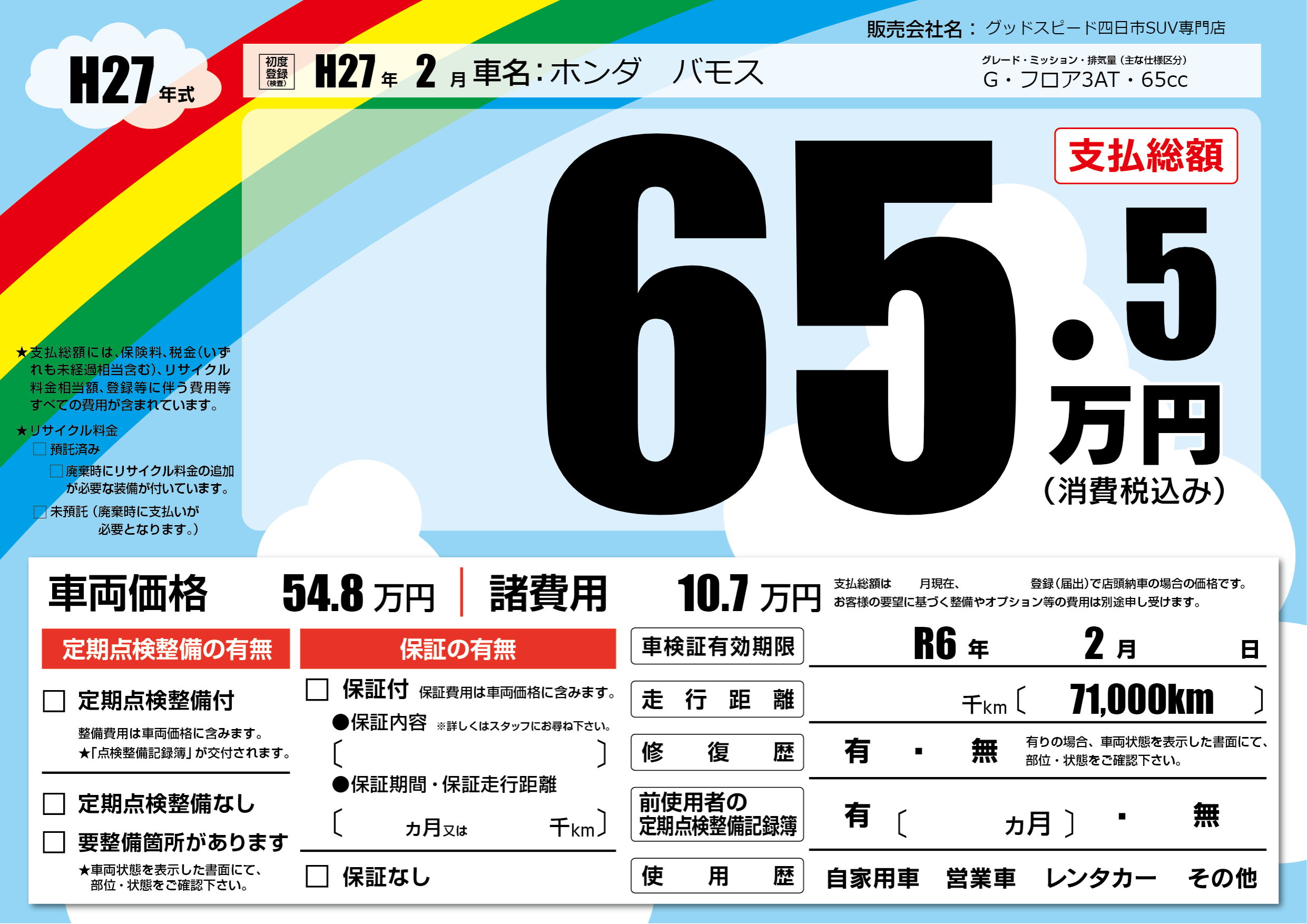 | 車名 | ホンダ バモス | グレード ミッション 排気量 |