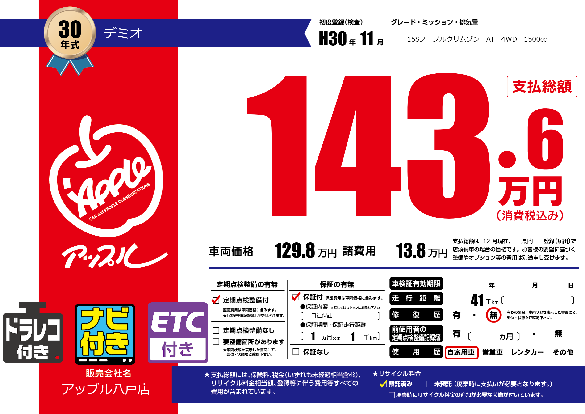 | 走行キロ | 4.1万km | 初年度登録 | H30年11月 |