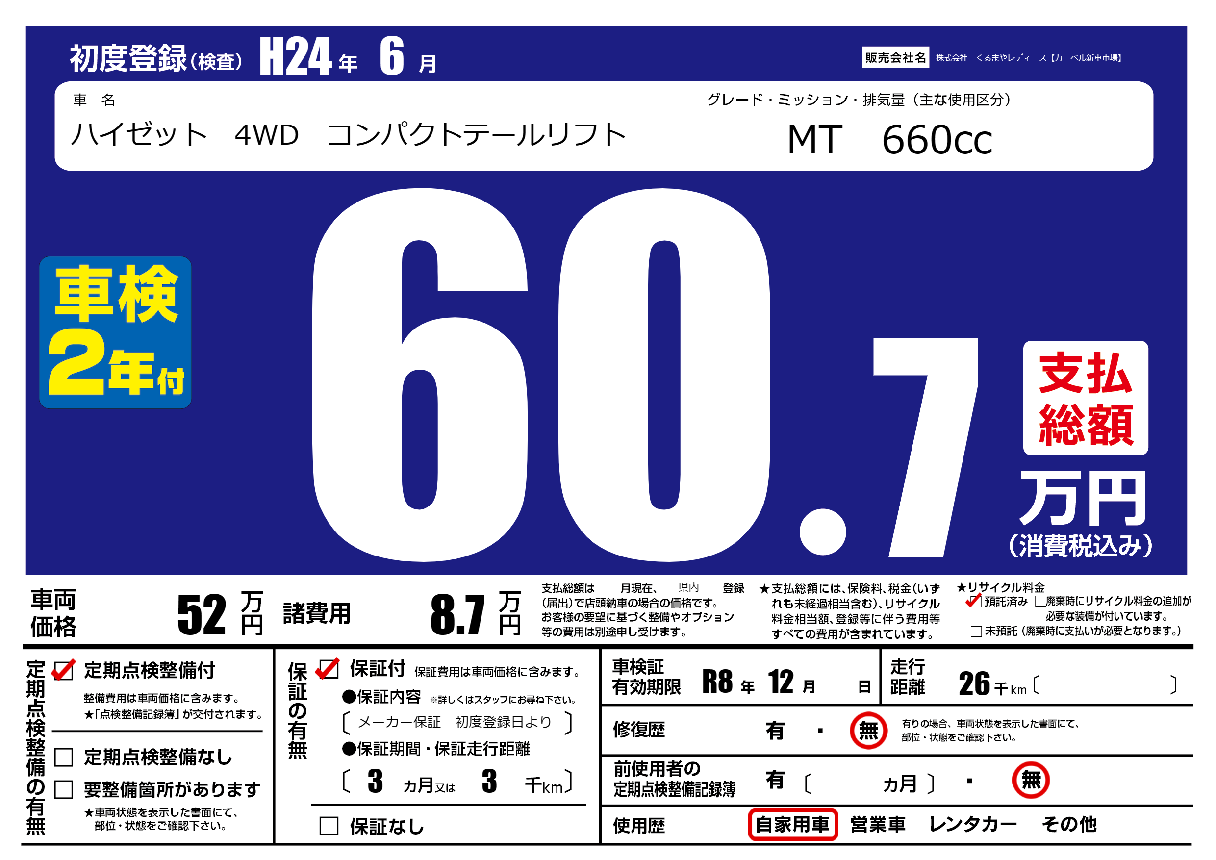 | 走行キロ | 2.6万km | 初年度登録 | H24年6月 |
