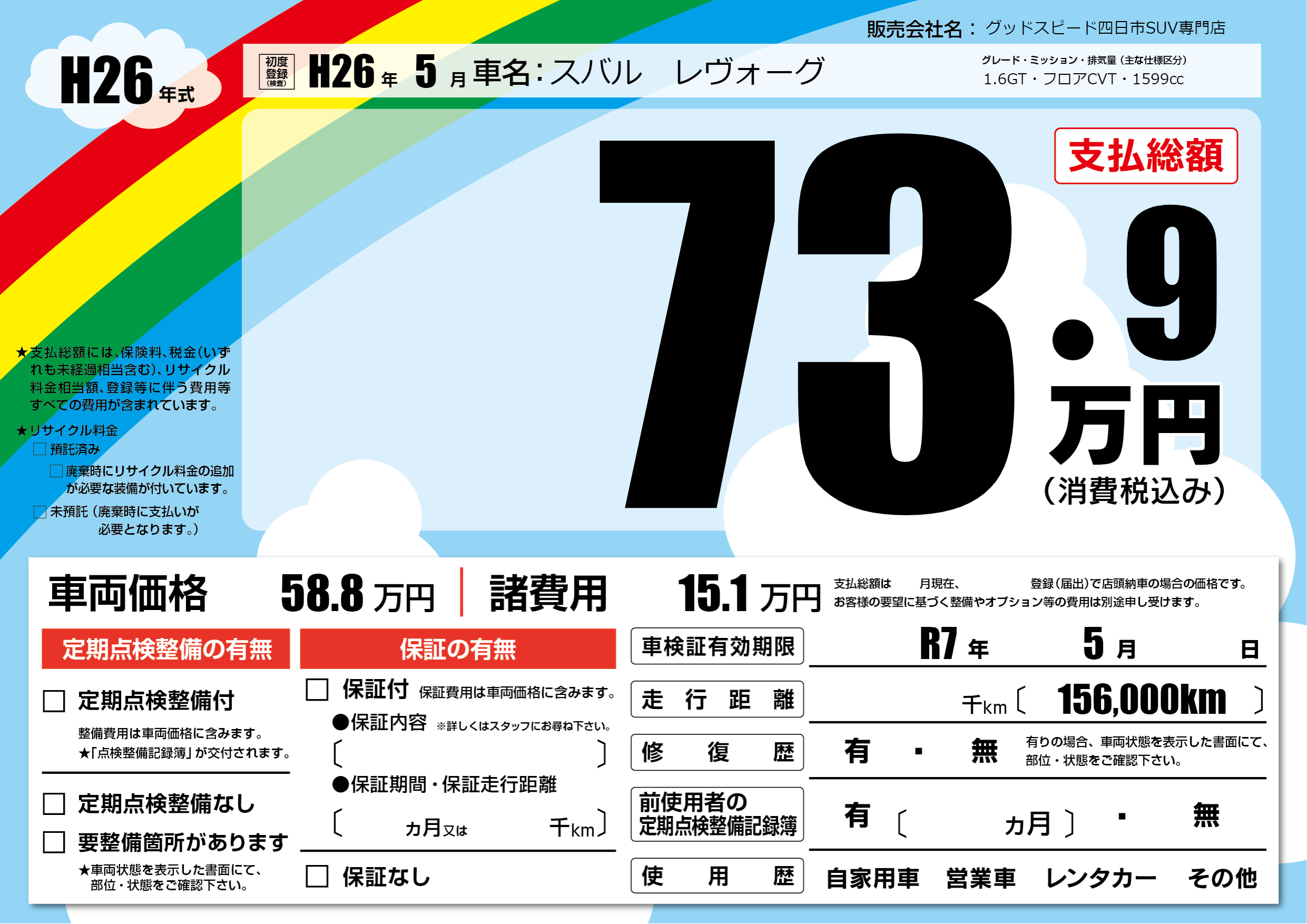 | 車検制限 | R7年 5月 - 日 | ||