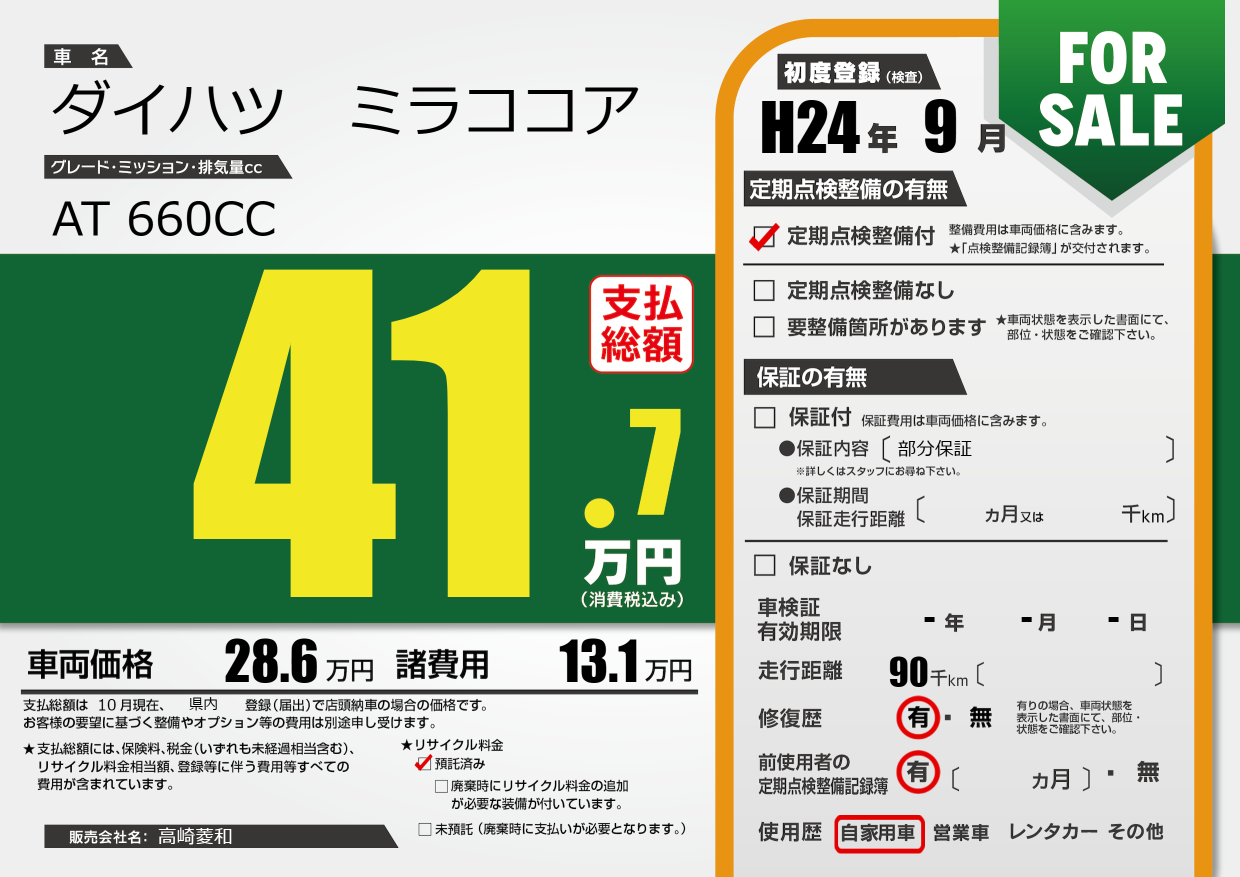 | 走行キロ | 9万km | 初年度登録 | H24年9月 |
