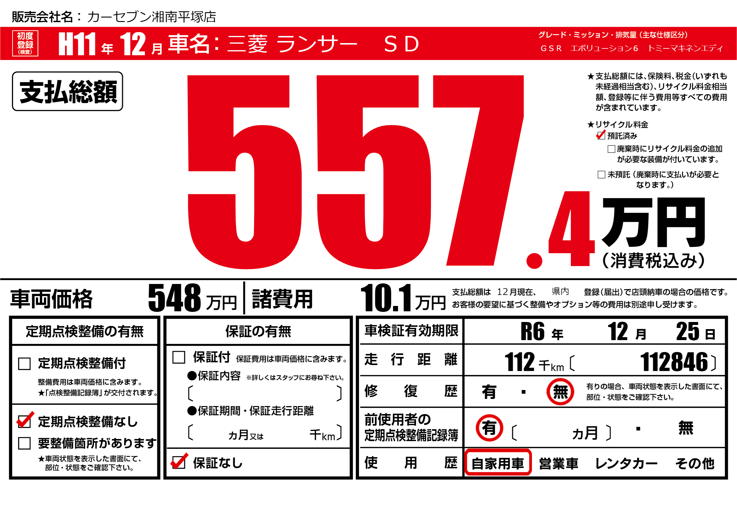 なし | 車検制限 | R6年12月25月 |