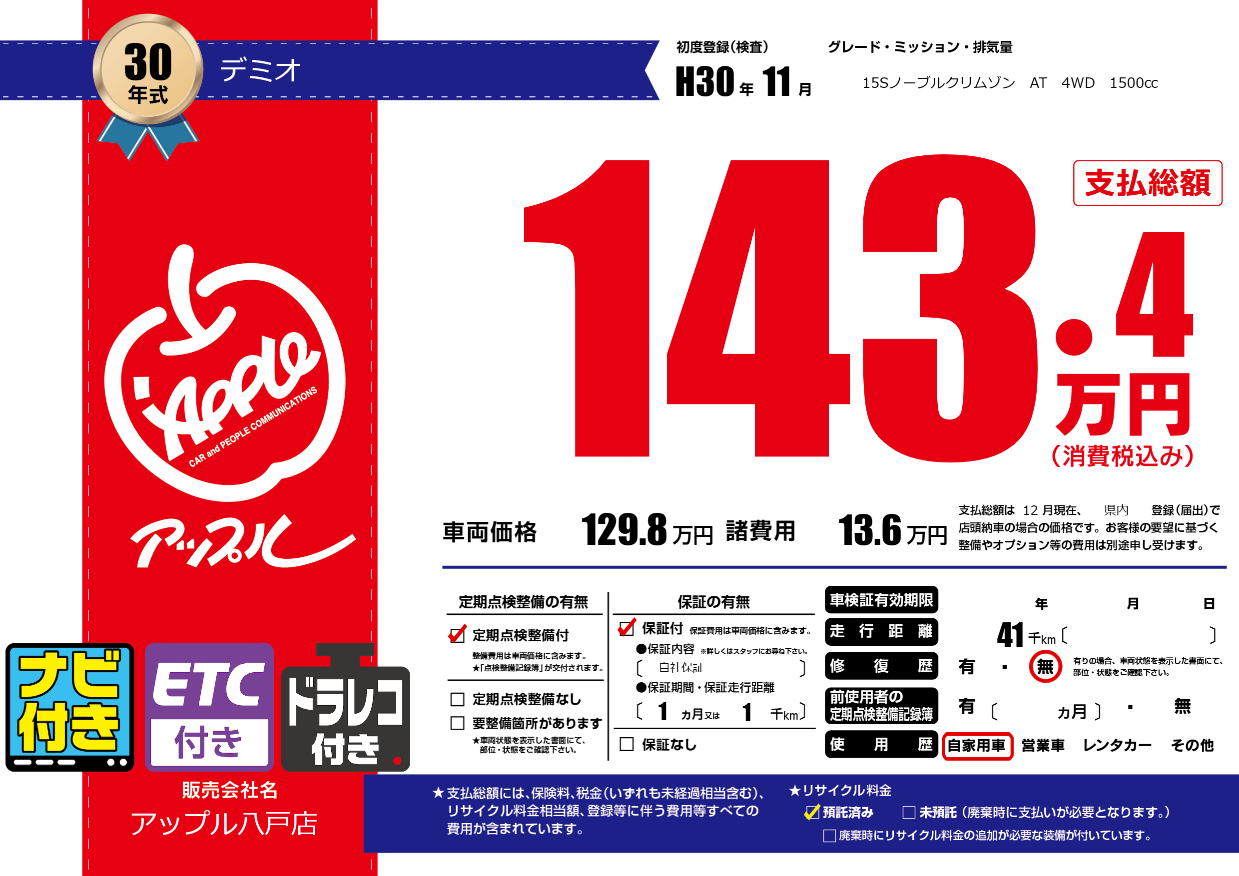 保証付き 保証内容( 自社保証) 1ヶ月または(1)千kmまで |