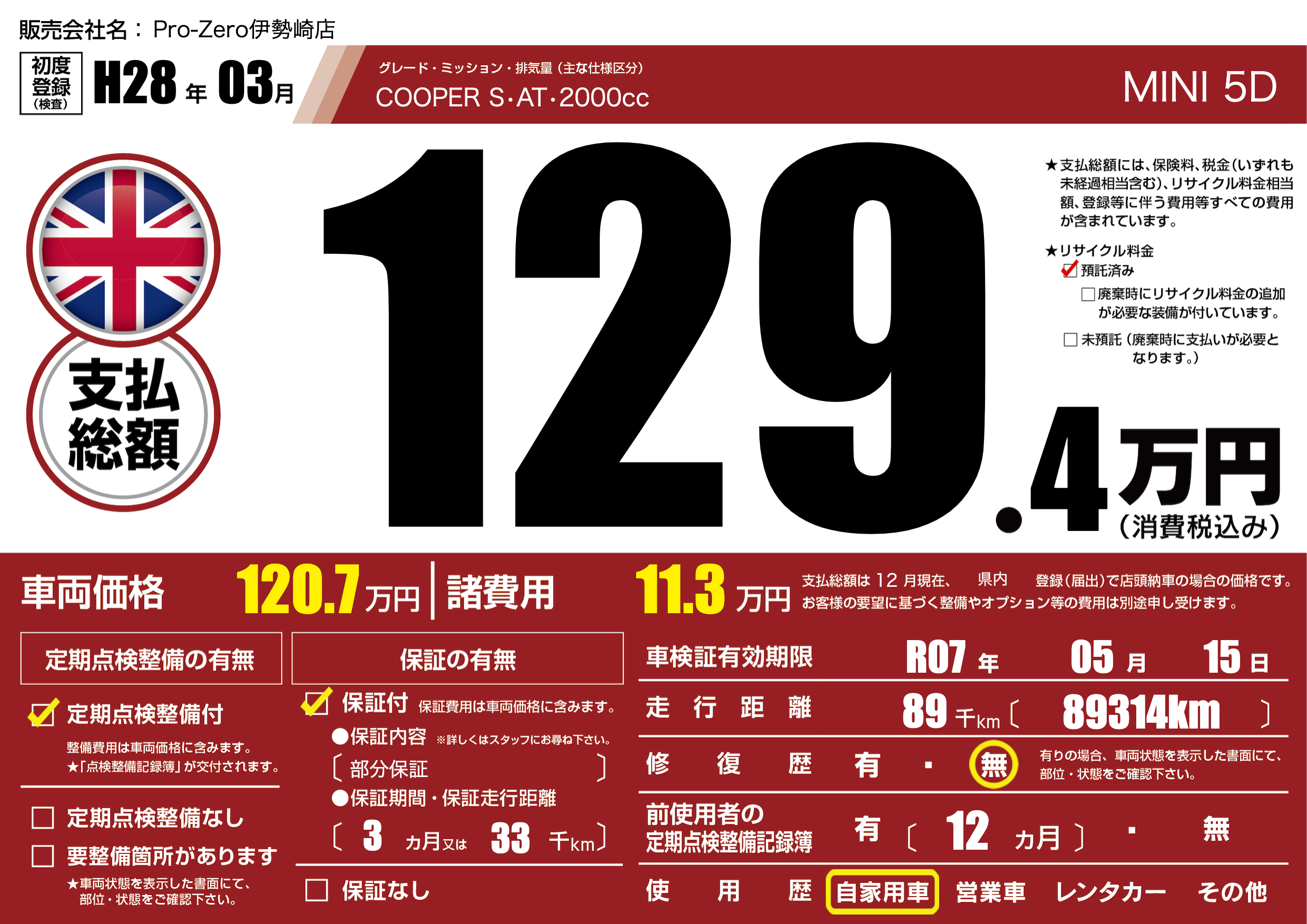 | 車名 | MINI 5D | グレード ミッション 排気量 |