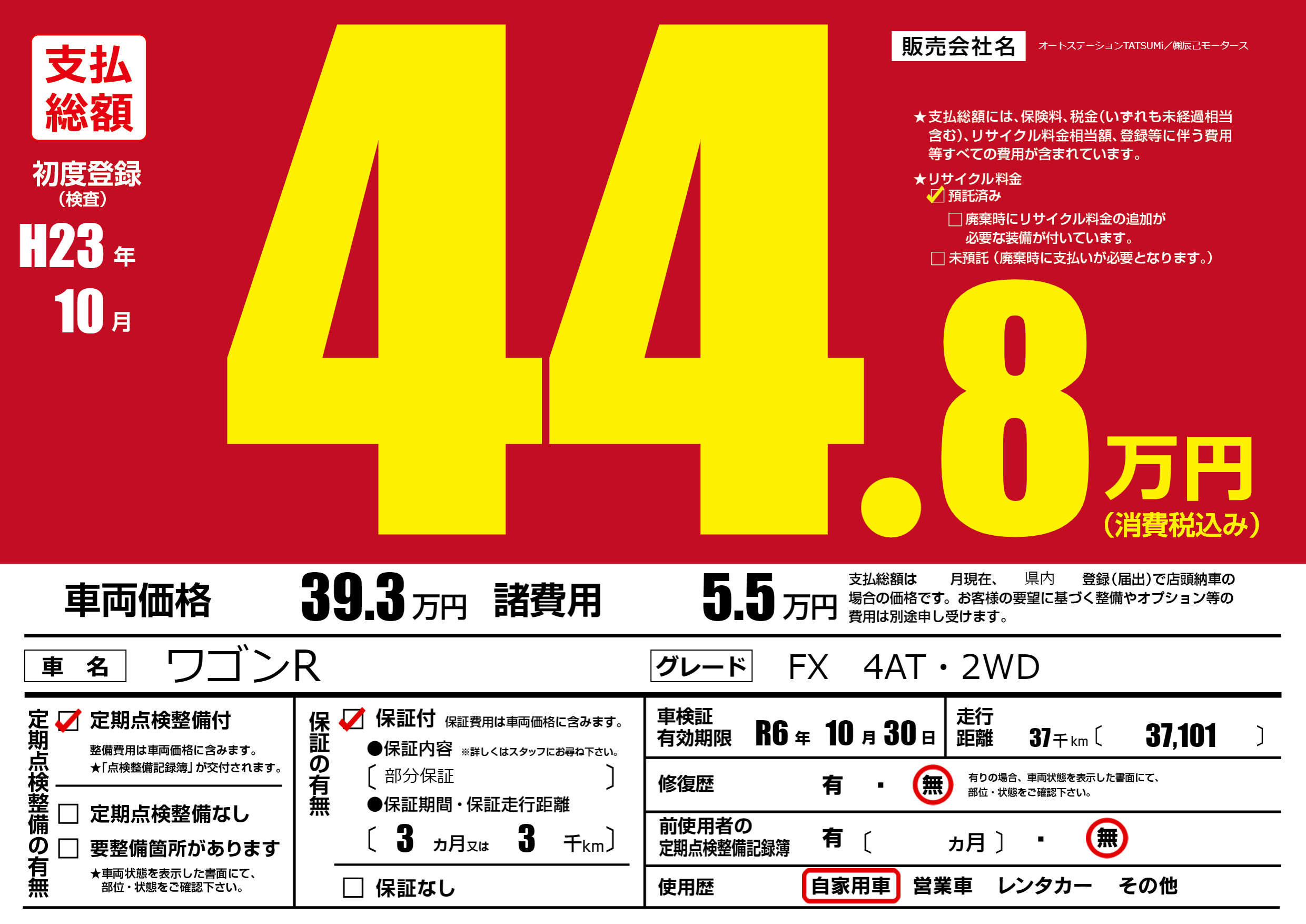 | 走行キロ | 3.7万km | 初年度登録 | H23年10月 |