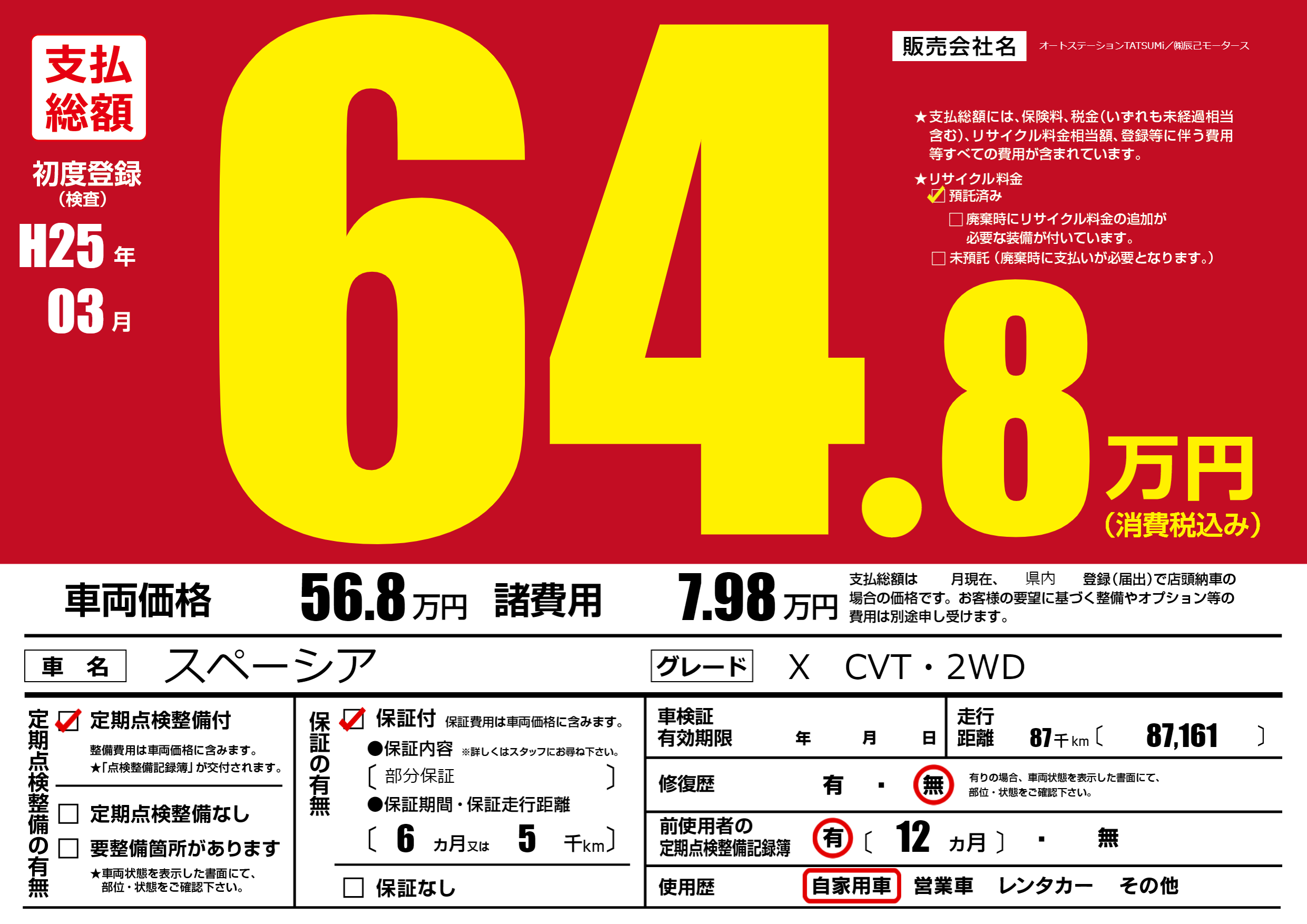 | 走行キロ | 8.7万km | 初年度登録 | H25年03月 |