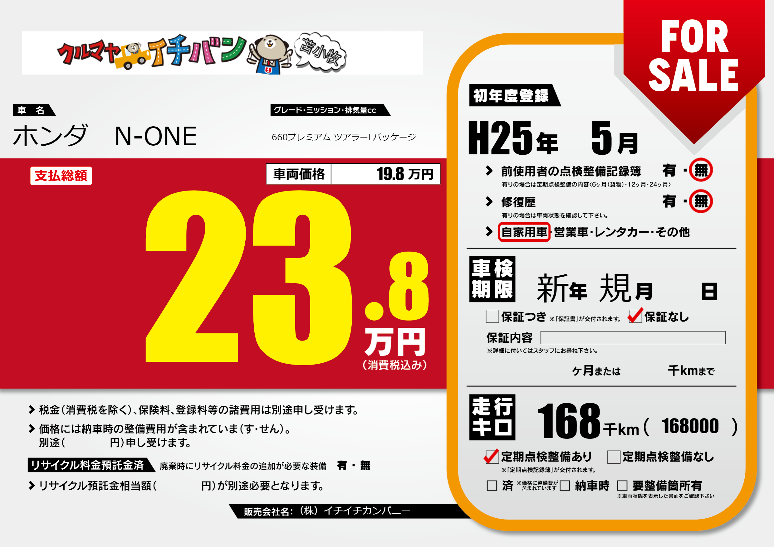 | 車名 | ホンダ N-ONE | グレード ミッション 排気量 |