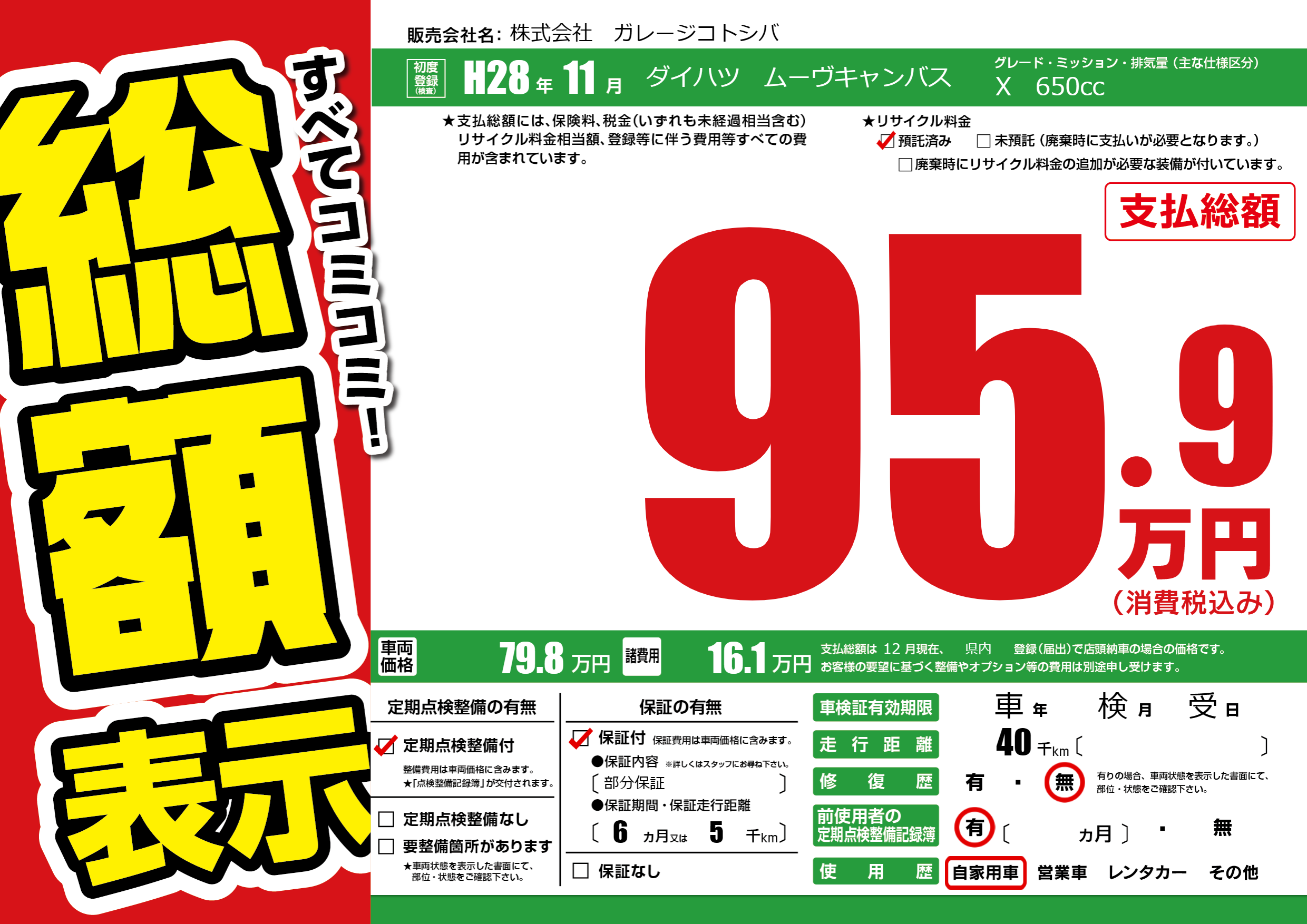 | 車名 | ダイハツ ムーヴキャンバス | グレード ミッション 排気量 |