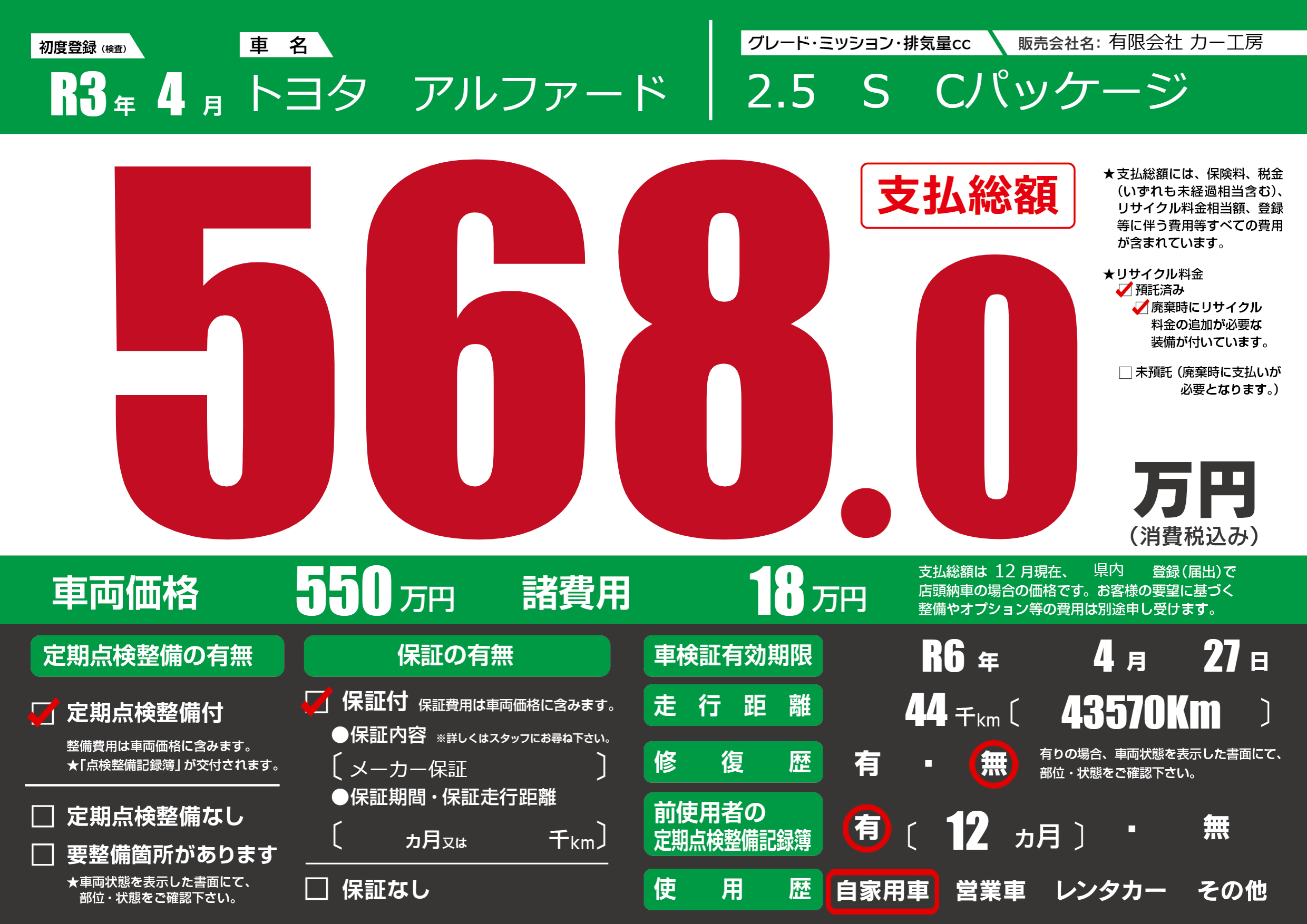 | 車名 | トヨタ アルファード | グレード ミッション 排気量 |