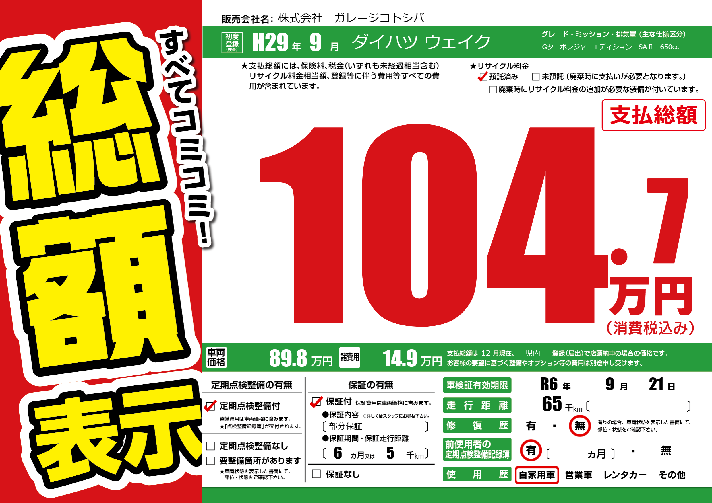 | 車名 | ダイハツ ウェイク | グレード ミッション 排気量 |