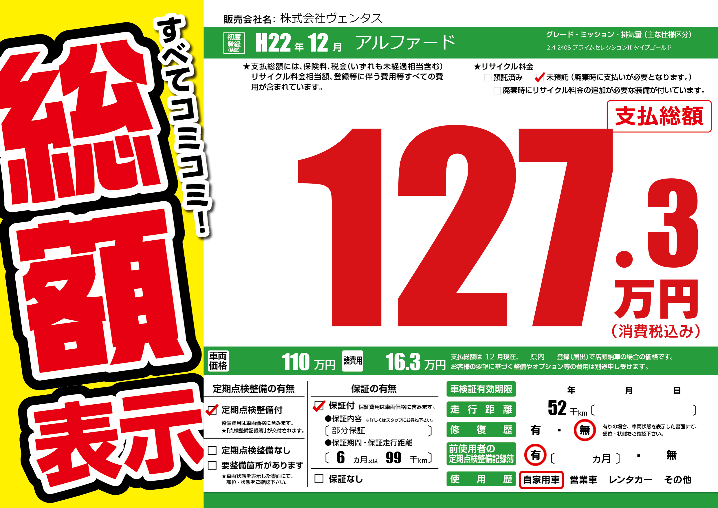 | 車名 | アルファード | グレード ミッション 排気量 |