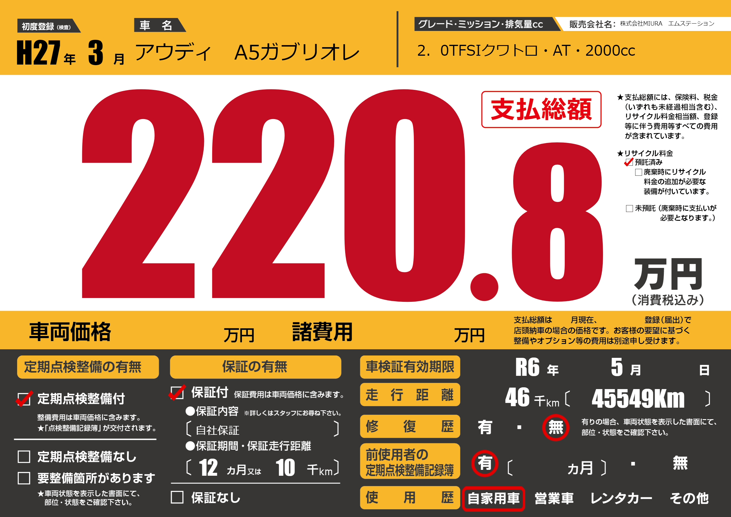 | 車名 | アウディ A5ガブリオレ | グレード ミッション 排気量 |