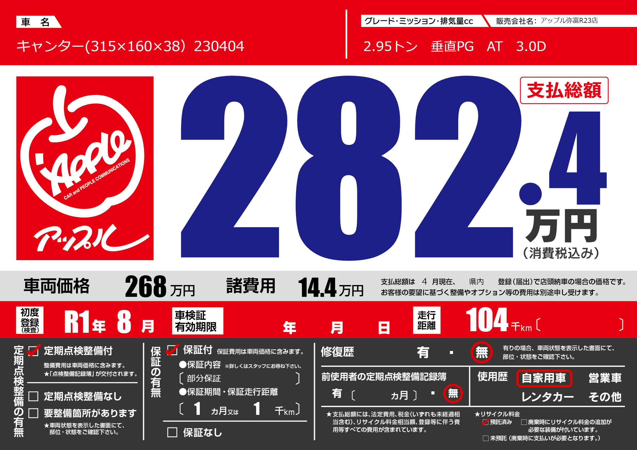 | 車名 | キャンター(315×160×38)230404 | グレード ミッション 排気量 |