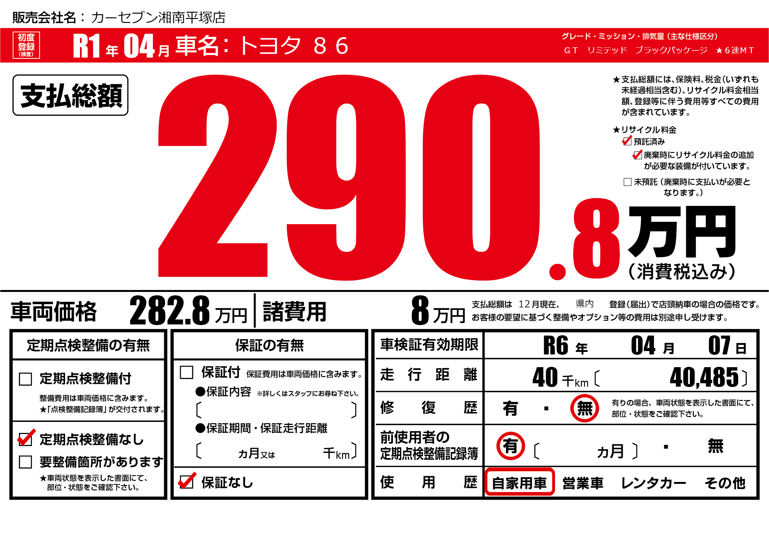 | 車名 | トヨタ 86 | グレード ミッション 排気量 |
