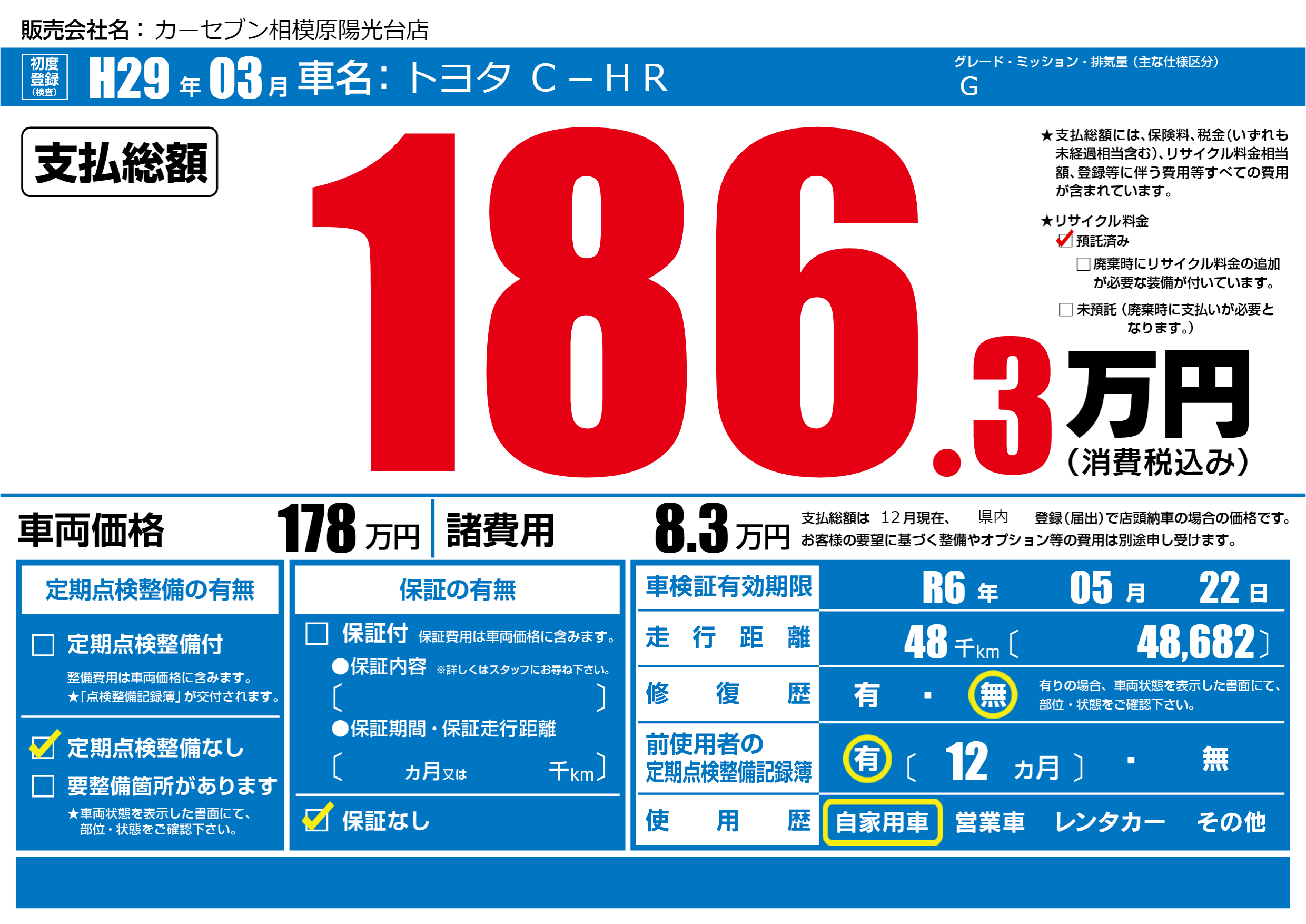 | 車名 | トヨタ C-HR | グレード ミッション 排気量 |