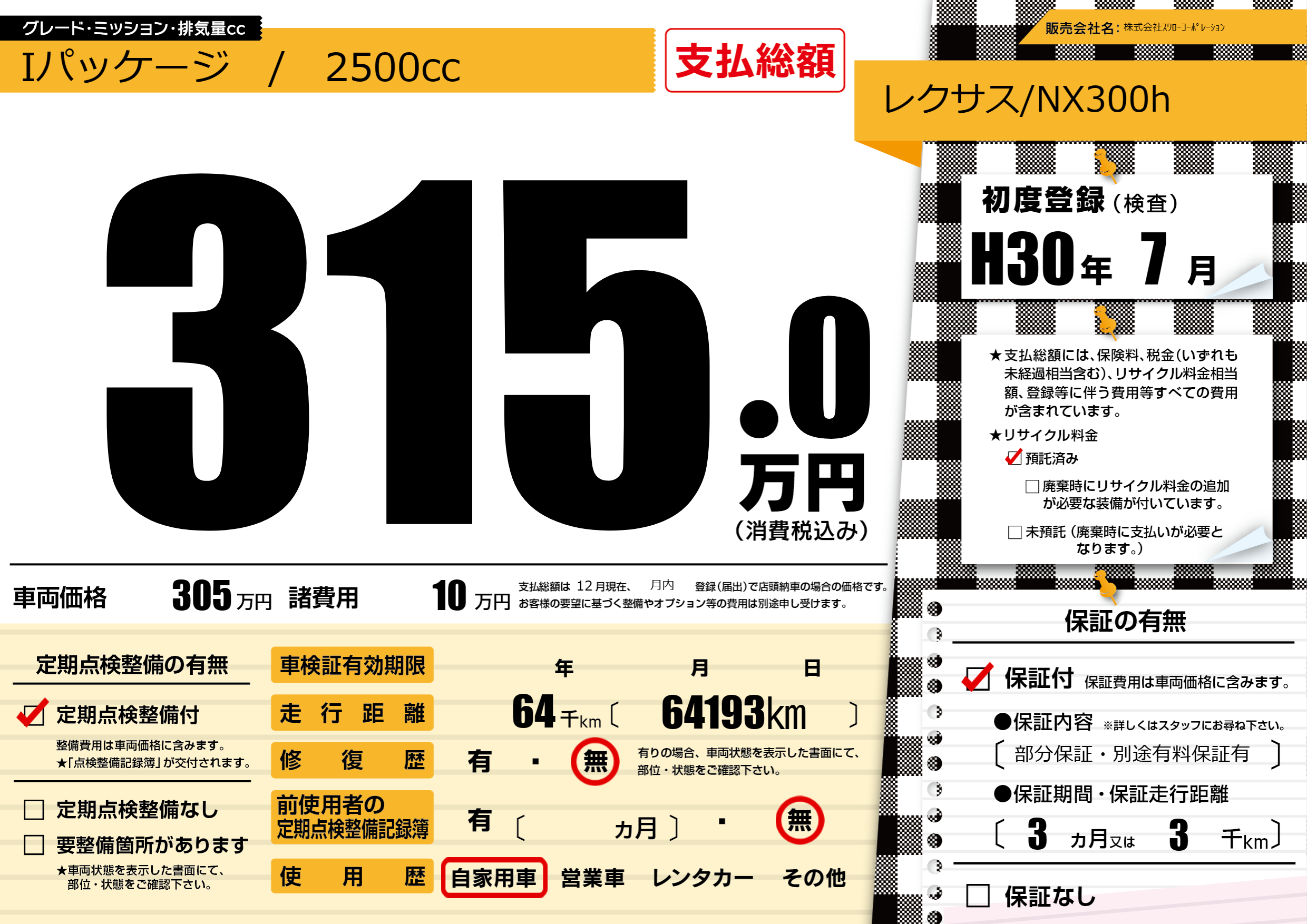 | 車名 | レクサス/NX300h | グレード ミッション 排気量 |