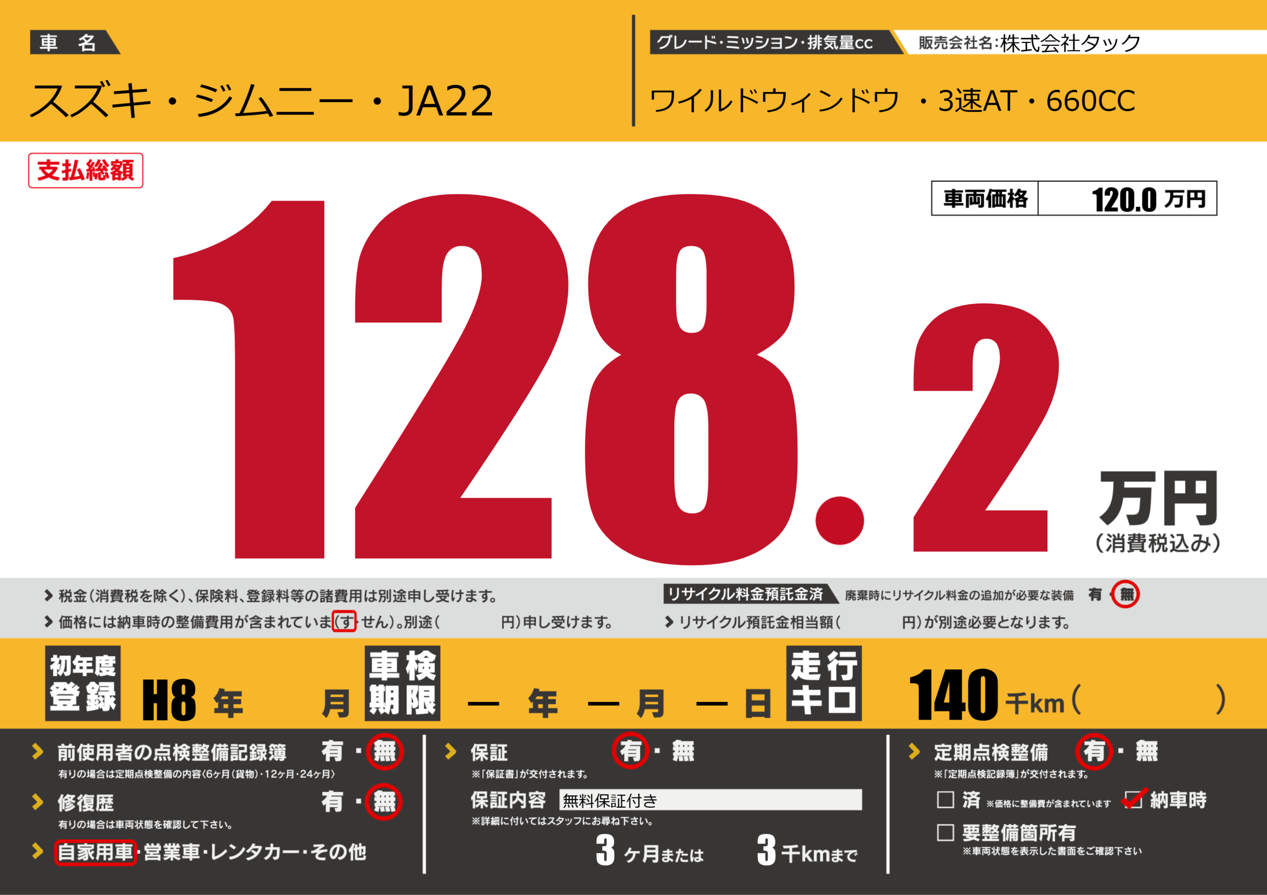 保証なし 保証内容(無料保証付き) 3ヶ月または(3)千kmまで |