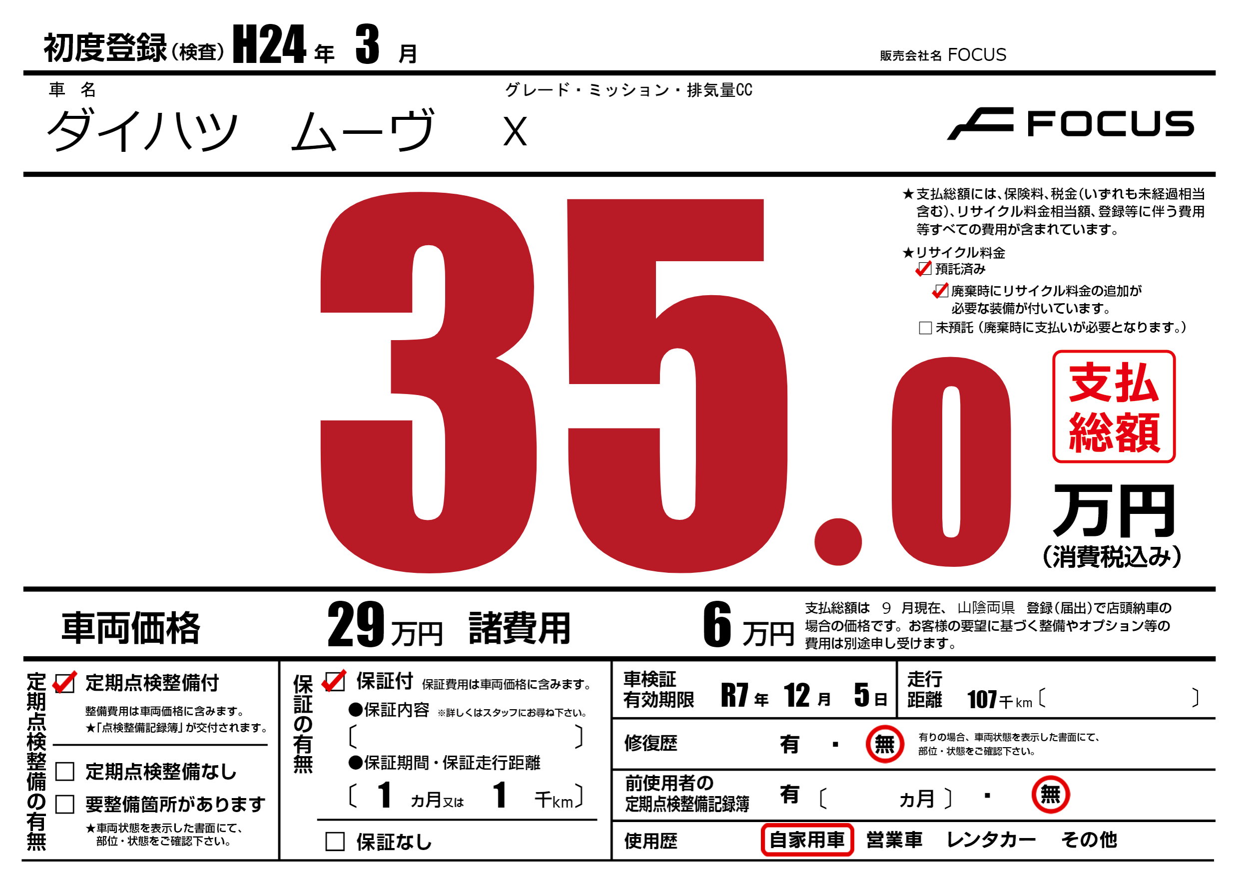 | 走行キロ | 10.7万km | 初年度登録 | H24年3月 |