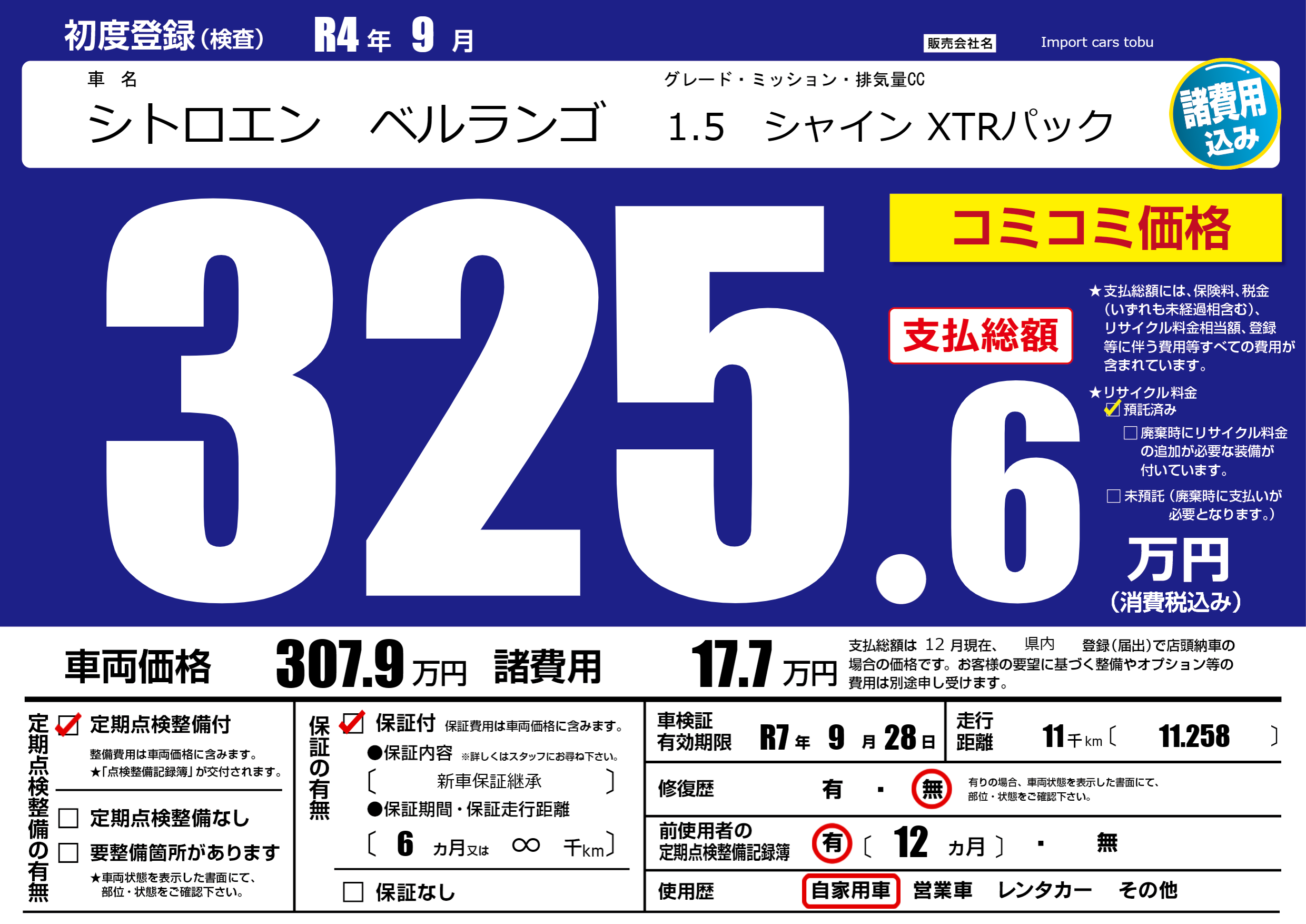 | 走行キロ | 1.1万km | 初年度登録 | R4年9月 |