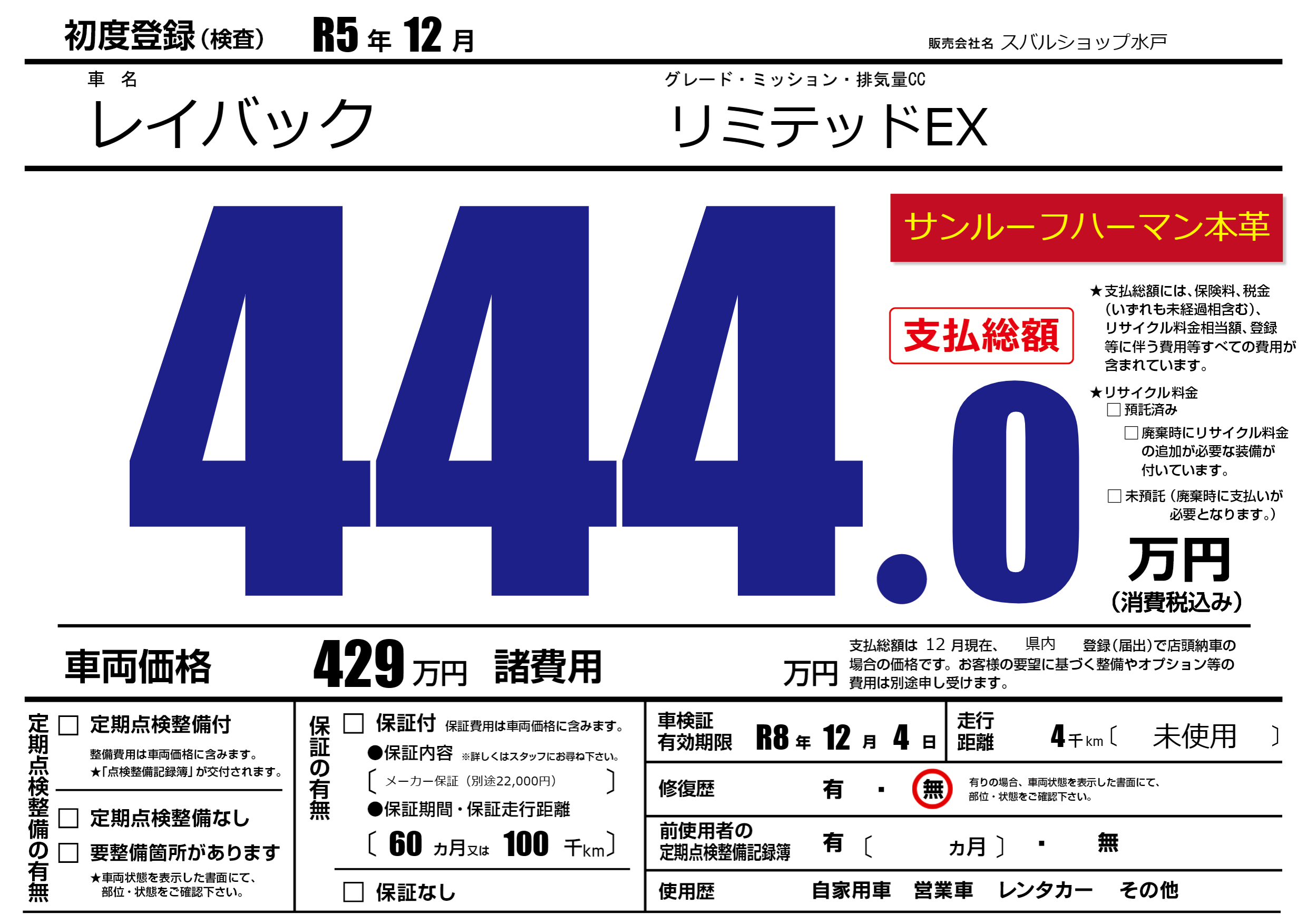 | 車名 | レイバック | グレード ミッション 排気量 |