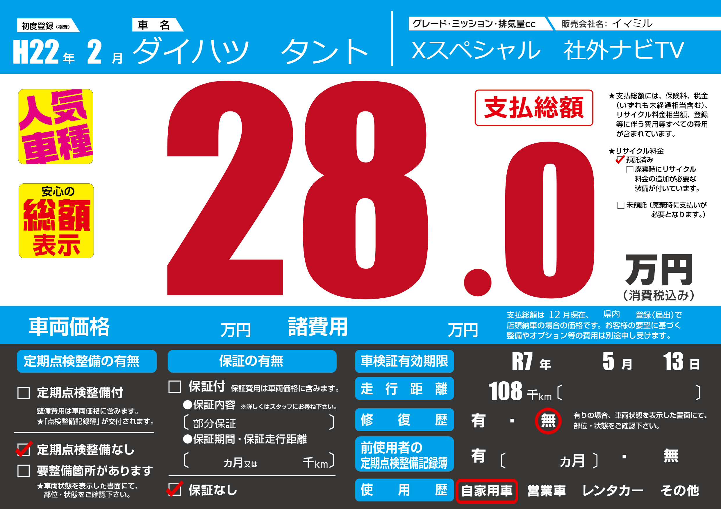 | 走行キロ | 10.8万km | 初年度登録 | H22年2月 |