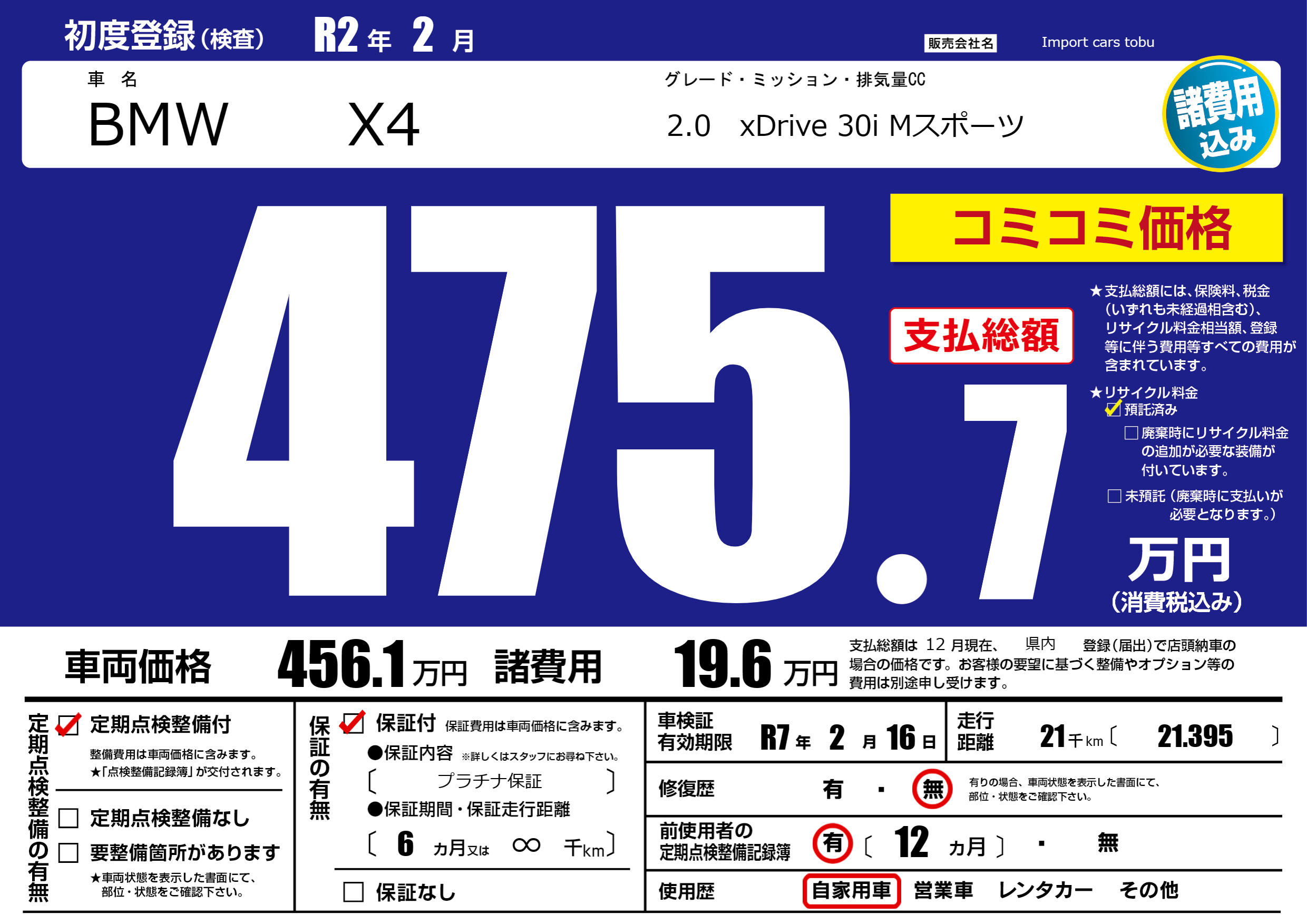 保証付き 保証内容( プラチナ保証) 6ヶ月または(∞)千kmまで |
