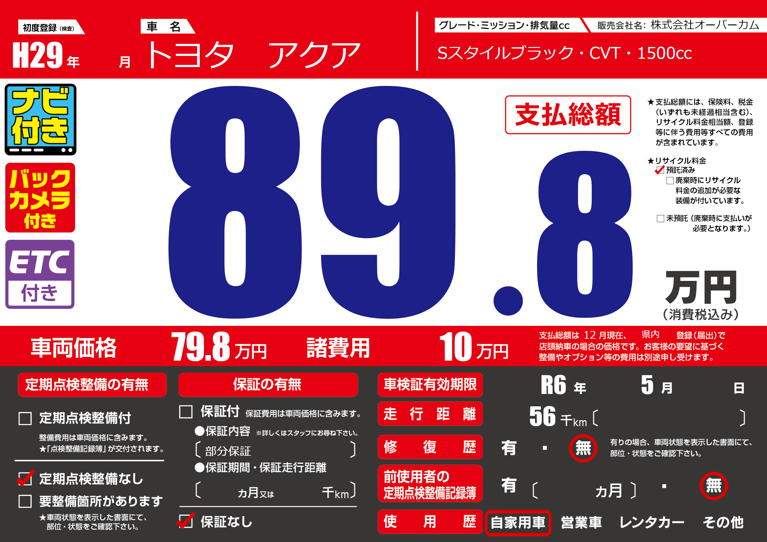 | 車名 | トヨタ アクア | グレード ミッション 排気量 |